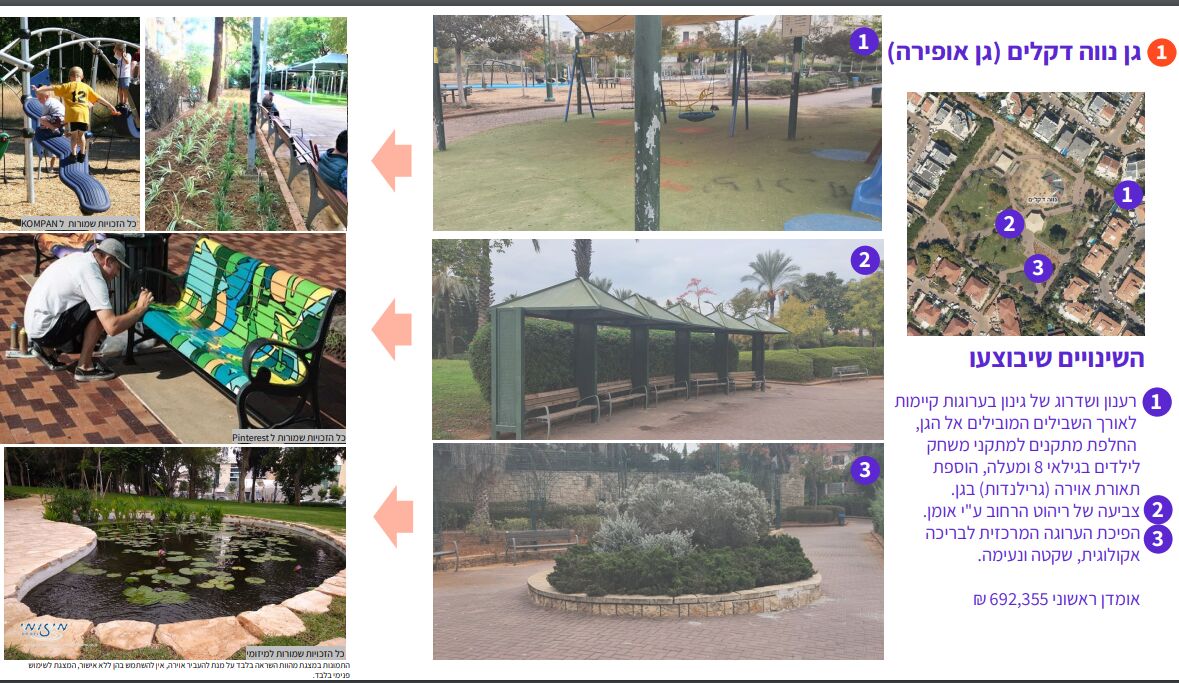 1. ריענון ושדרוג של הגינון בערוגות קיימות לאורך השבילים המובילים אל הגן, החלפת מתקנים למתקני משחק לילדים בגילאי 8 ומעלה, הוספת תאורת אוירה (גרילנדות) בגן.