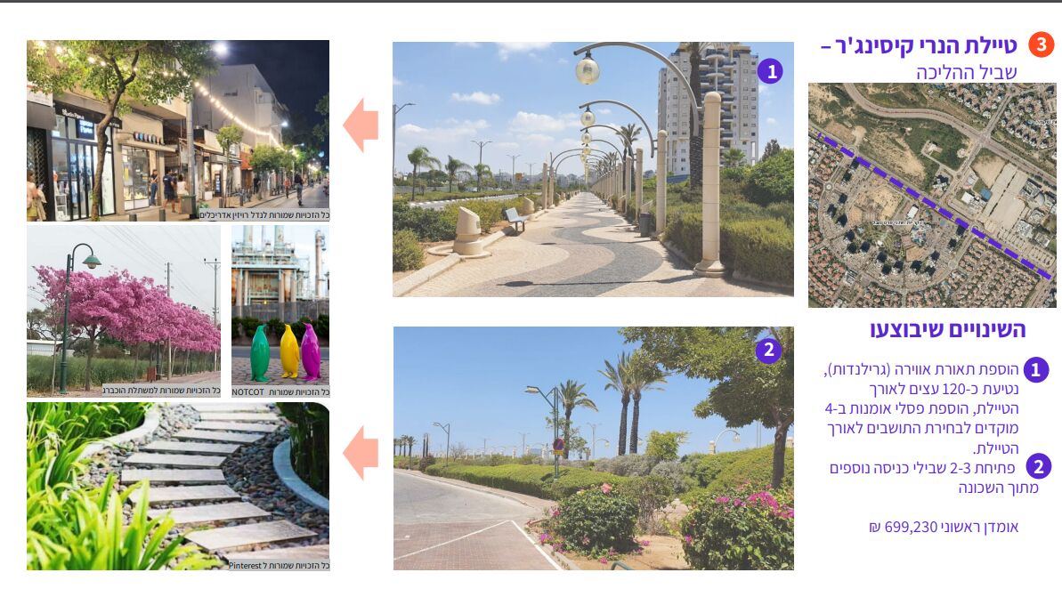 1. הוספת תאורת אווירה (גרילנדות), נטיעת כ -120 עצים לאורך הטיילת, הוספת פסלי אומנות ב-4 מוקדים לבחירת התושבים לאורך הטיילת.