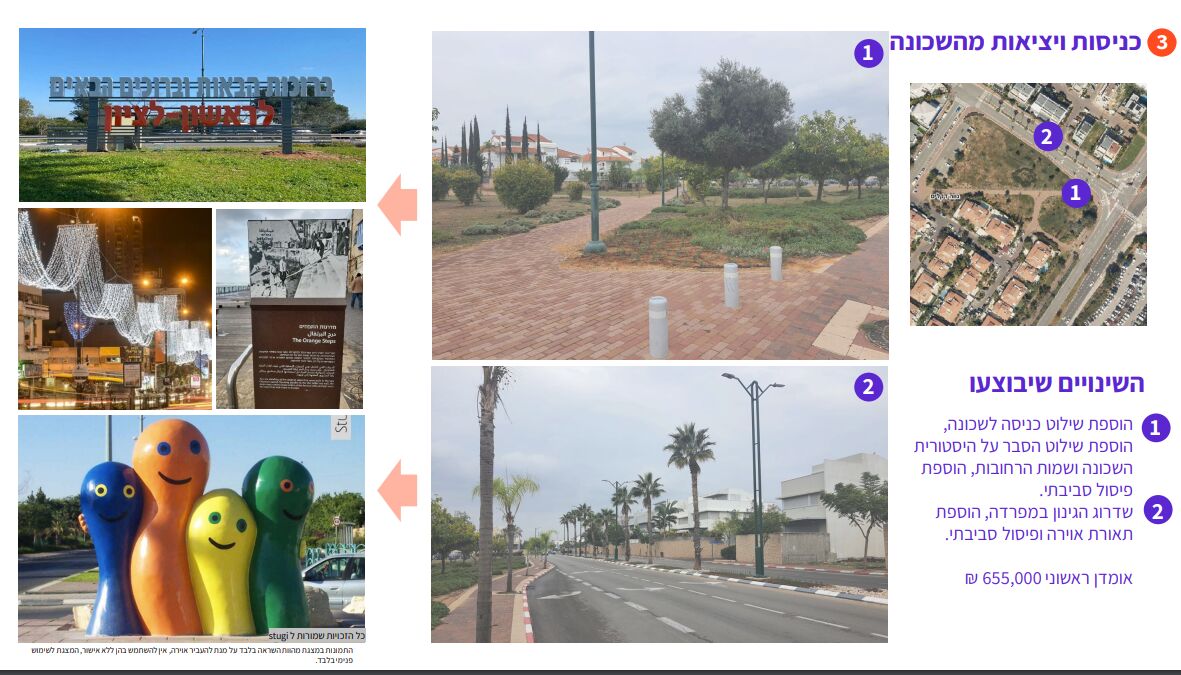 1. הוספת שילוט כניסה לשכונה, הוספת שילוט הסבר על היסטורית השכונה ושמות הרחובות, הוספת פיסול סביבתי.
