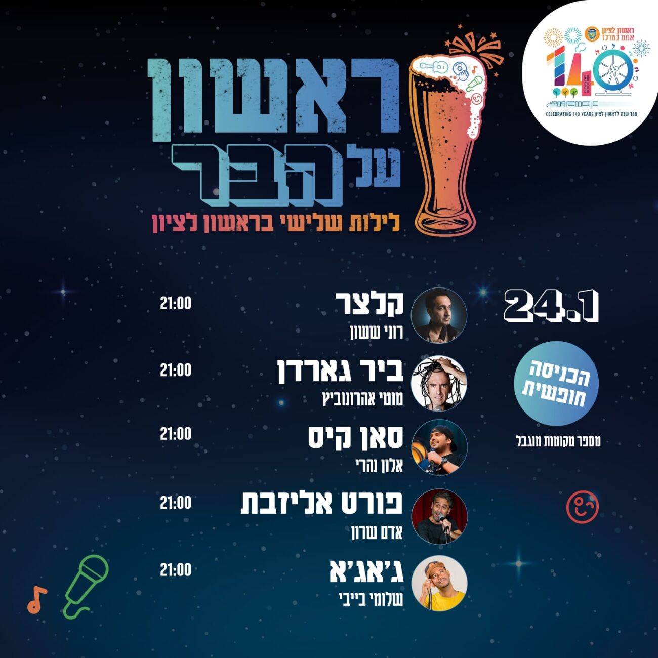 רז קינסטליך, ראש עיריית ראשון לציון: "אנחנו ממשיכים בחגיגות ה-140, והפעם באירוע שמותאם לחיי הלילה התוססים שלנו כאן בעיר. אני מזמין אתכם ואתכן להגיע אל עיר התרבות של ישראל וליהנות משלל הרצאות, מופעי סטנדאפ ומוזיקה של מיטב האמנים והיוצרים המוכשרים, בהם גם תושבי העיר - הגאווה הראשונית שלנו".