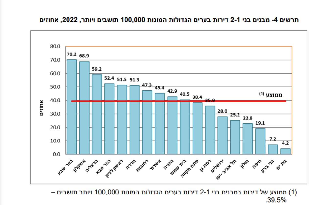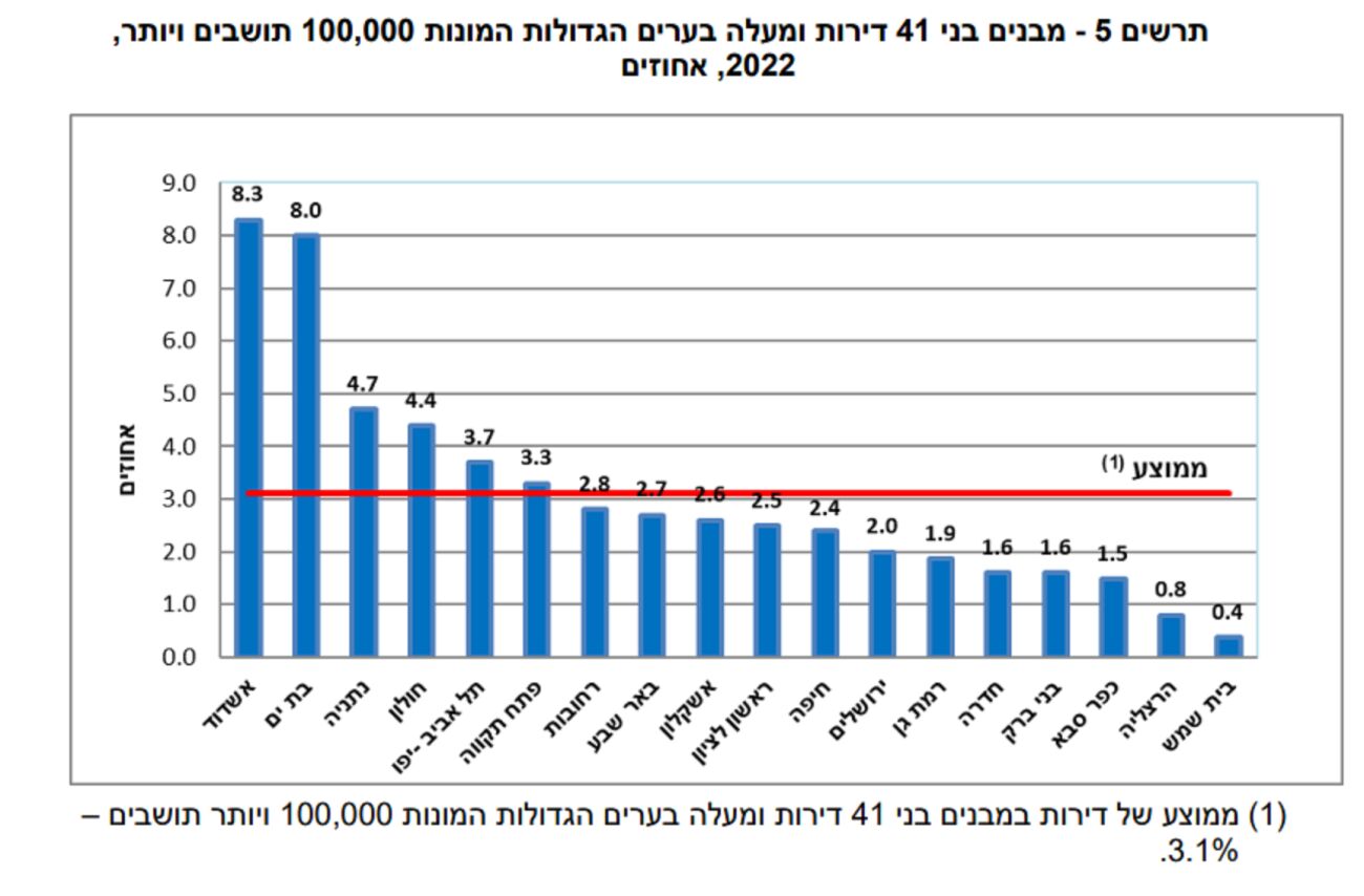 בשנת 2022 ב18 בערים הגדולות נמצאו 1.46 מיליון דירות בכ148.9 אלף מבנים. על פי הנתונים בכל הערים הגדולות קיימים מבנים בהם יש 41 דירות ומעלה כאשר האחוז הגבוה ביותר נמצא בעיר אשדוד עם 8.3% אחריה נמצאת בת ים עם 8%, נתניה 4.7% חולון 4.4%, תל אביב 3.7% ופתח תקווה 3.3%