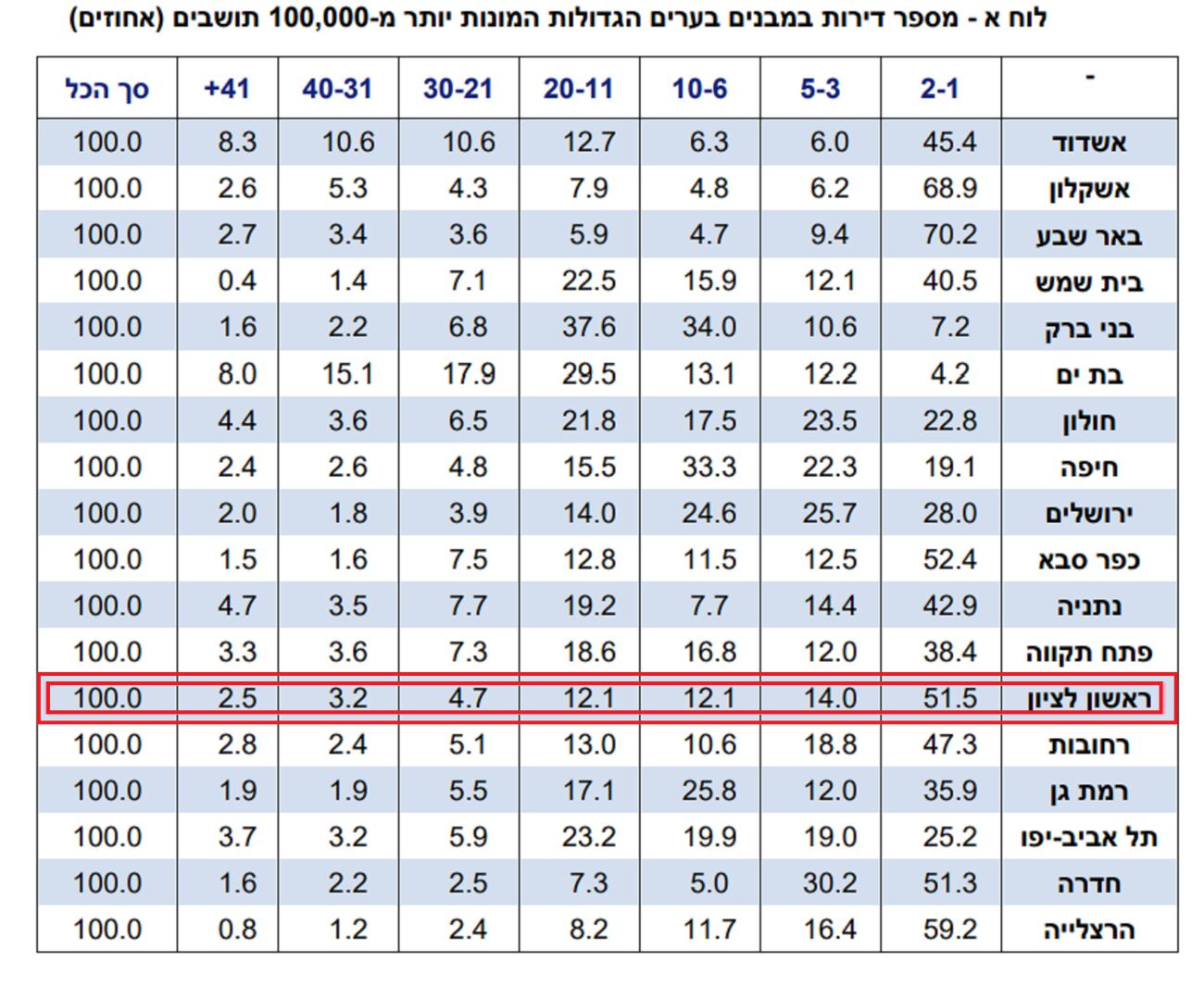 לעומת זאת הערים בהם האחוז הגבוה ביותר של מבנים בני 1-2 דירות נמצא באר שבע עם 70.2% ובאשקלון. גם ראשון לציון נמצאת ברשימה כאשר 51.5% מהבנים בעיר הם מבנים עם 1-2 דירות. אחוז המבנים עם יותר מ41 דירות עומד בעיר על 2.5% בלבד.