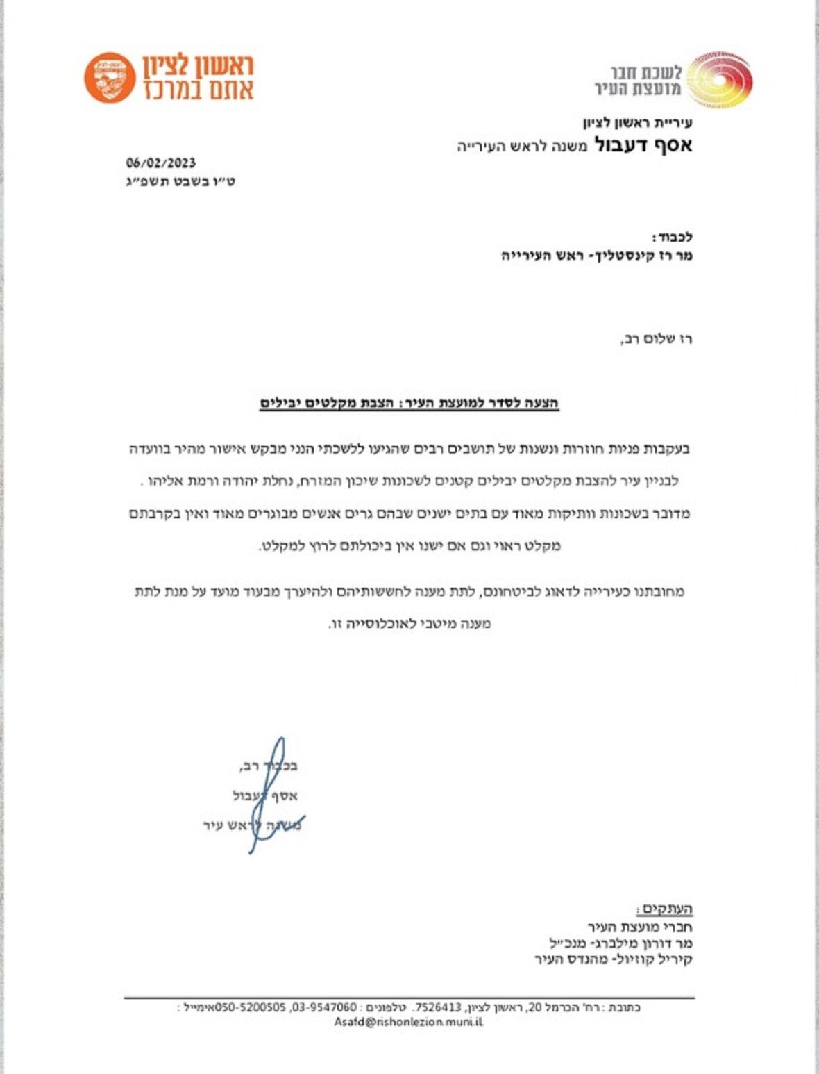 אסף דעבול מבקש להציב מקלטים יבילים בשכונות שיכון המזרח, נחלת יהודה ורמת אליהו על מנת לתת מענה לאוכלוסייה המבוגרת שאין בסביבתם מרחבים מוגנים