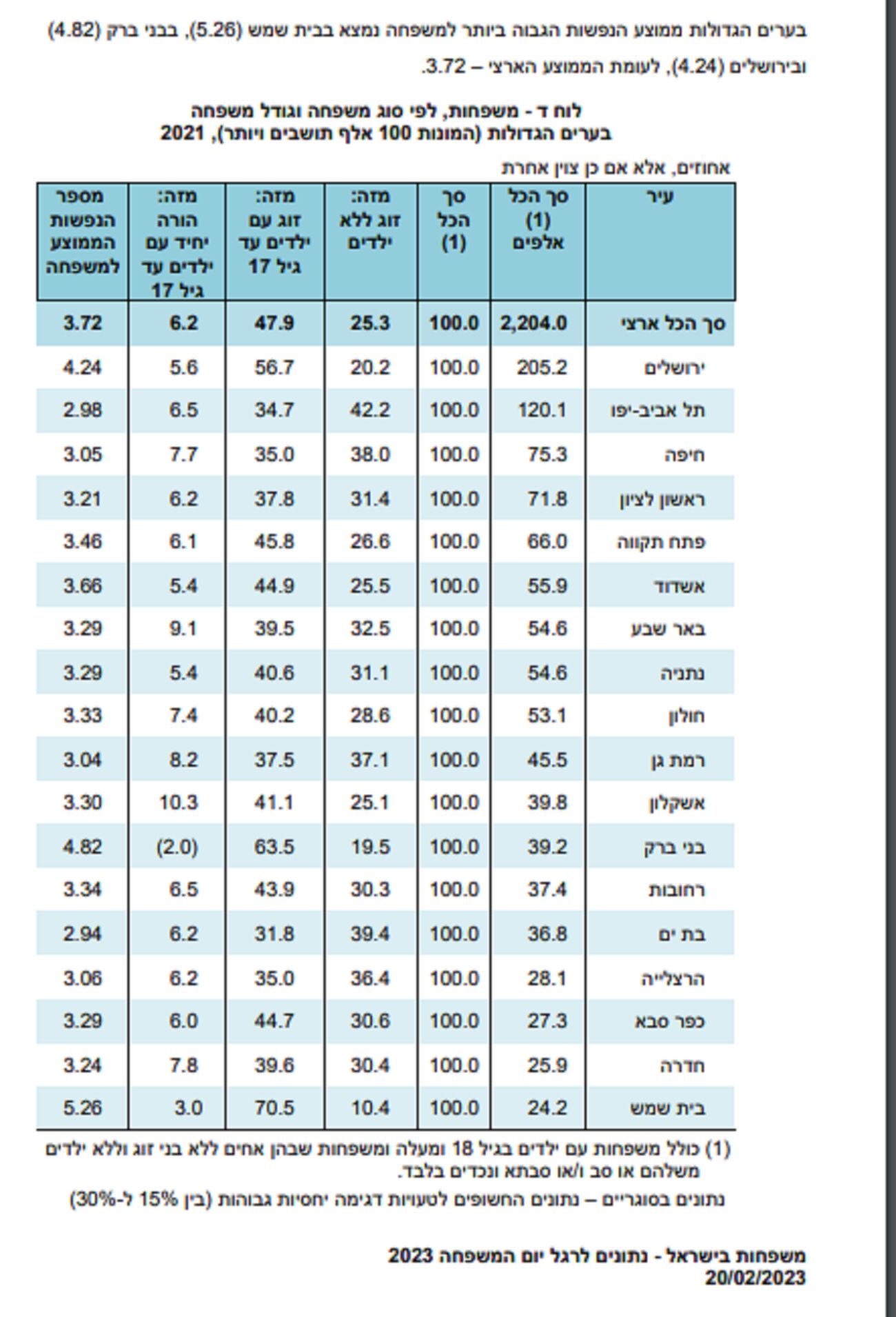 מבחינת ממוצע הנפשות במשפחה בית שמש גם מובילה עם ממוצע של 5.26 נפשות אחריה נמצאות בני ברק עם 4.82 נפשות וירושלים עם 4.24 נפשות.
