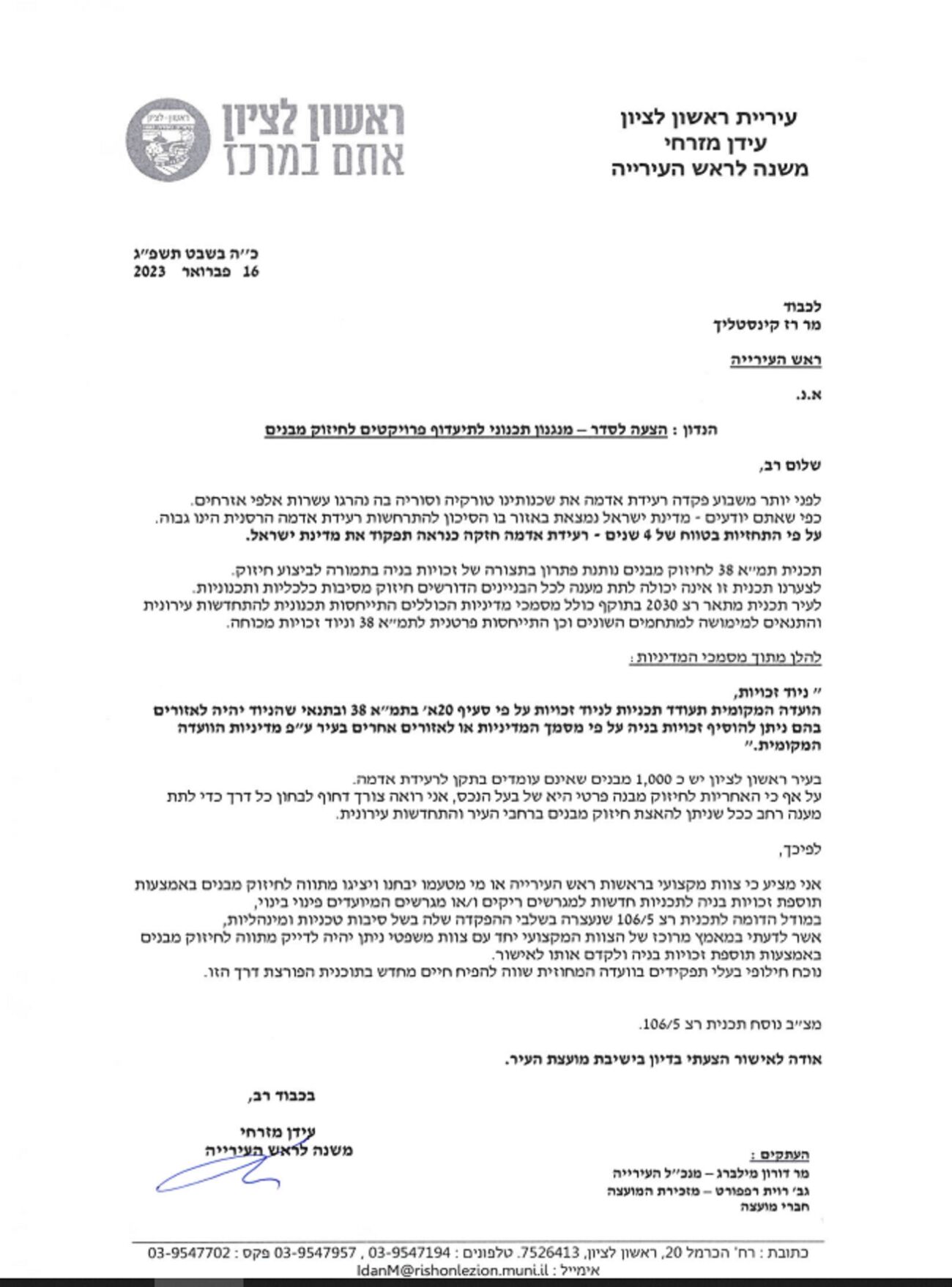 "אני מציע כי צוות מקצועי בראשות ראש העירייה או מי מטעמו יבחנו ויציגו מתווה לחיזוק מבנים באמצעות תוספת זכויות בניה לתכניות חדשות למגרשים ריקים ו/או מגרשים המיועדים פינוי בינוי, במודל הדומה לתכנית רצ 106/5(תוכנית שמאפשרת חיזור מבנים על ידי העברת זכויות הבנייה לאזורים אחרים או מגרשים ריקים המיועדים למגורים). שנעצרה בשלבי ההפקדה שלה בשל סיבות טכניות ומינהליות. במאמץ מרוכז של הצוות המקצועי יחד עם הצוות משפטי ניתן יהיה לדייק מתווה לחיזוק מבנים באמצעות תוספת זכויות בניה ולקדם אותו לאישור כדי להגן על תושבינו", כתב מזרחי בהצעה לסדר.