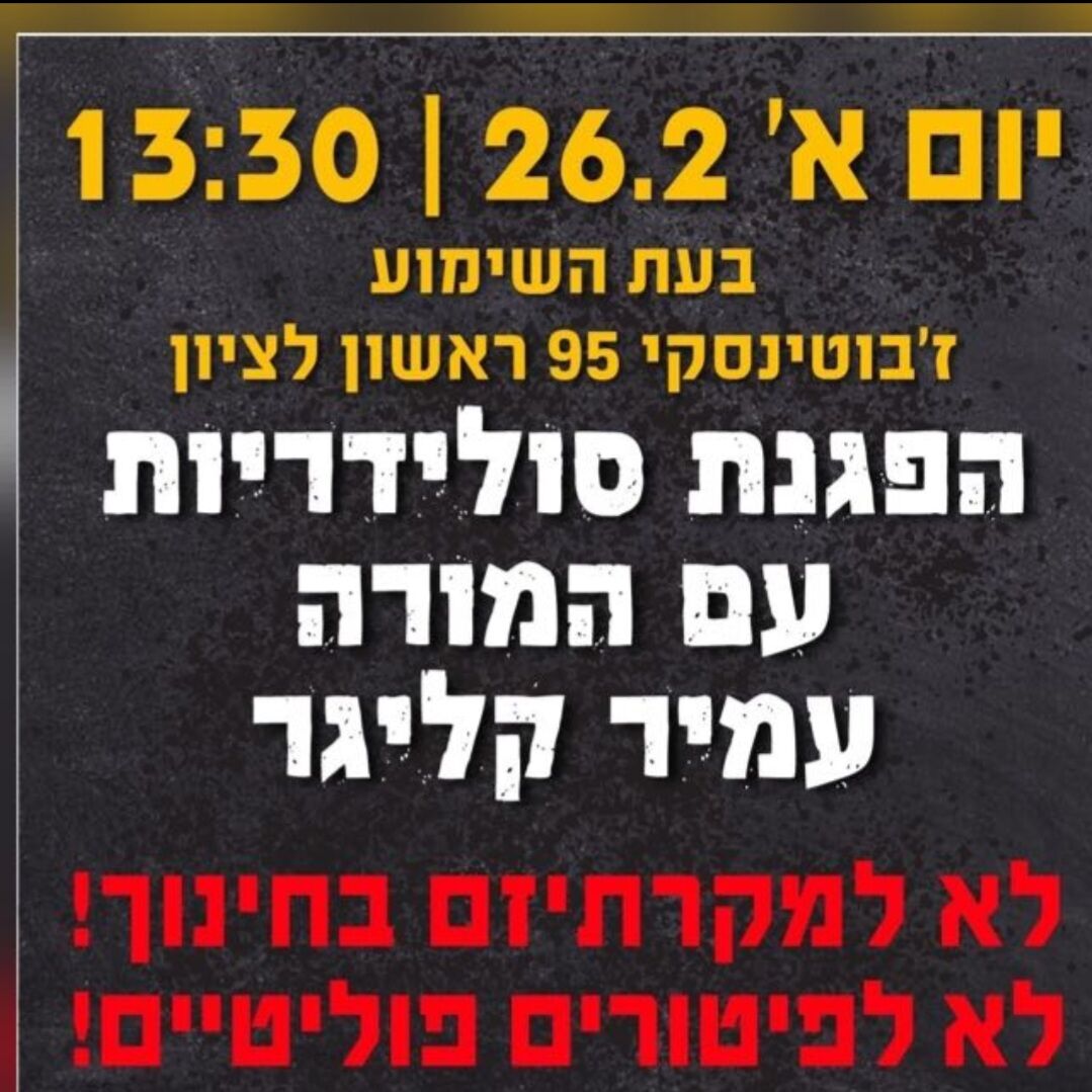 ניפגש ביום א`, 26.2, בשעה 13:30 בחברה העירונית ברחוב ז`בוטינסקי 95 ראשל"צ במחאה על איומים בפיטורי המורה ממכון רון ורדי.