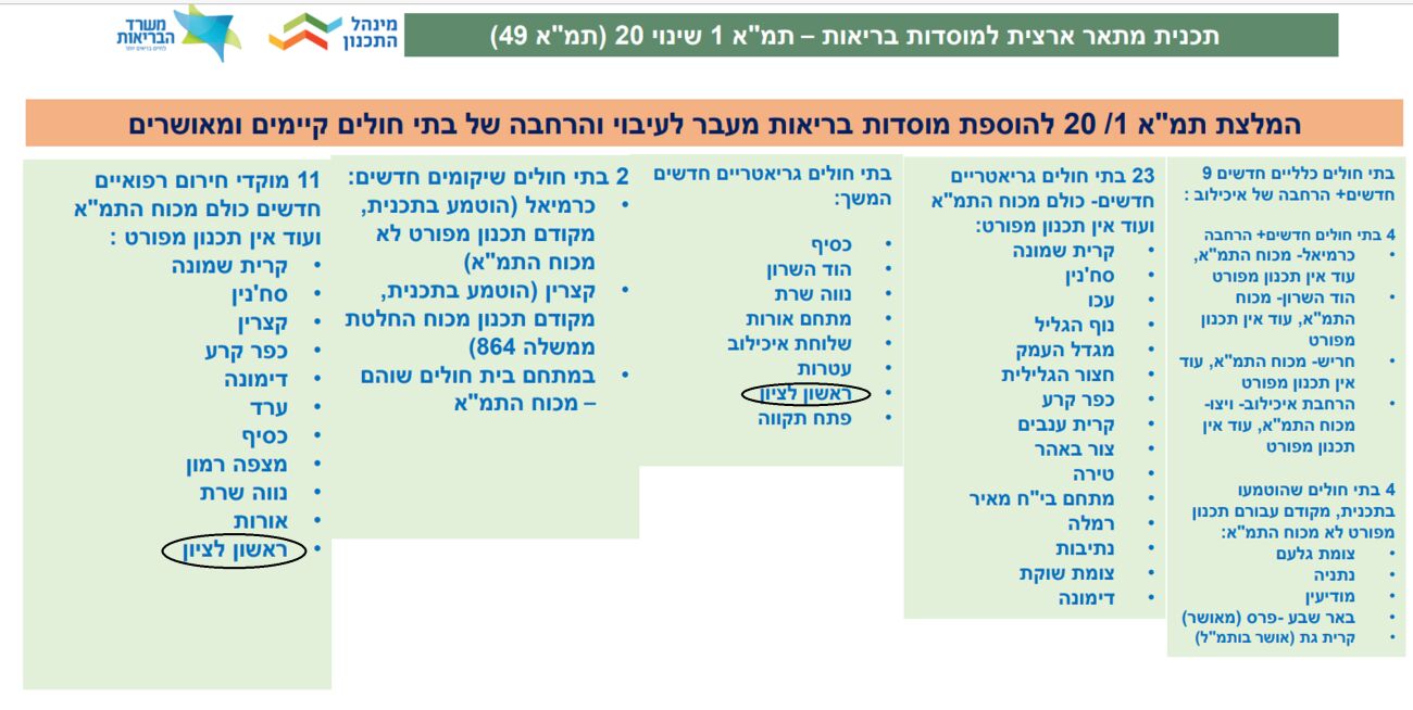 התוכנית מדבר על התחדשות ותוספת בינוי ב40 מוסדות בריאות קיימים בנוסף להקמת בתי חולים, בתי חולים גריאטריים, בתי חולי שיקומיים ומוקדי חירום חדשים ברחבי הארץ. בראשון לציון עתיד לקום בית חולים גריאטרי חדש וכן מוקד חירום רפואי.