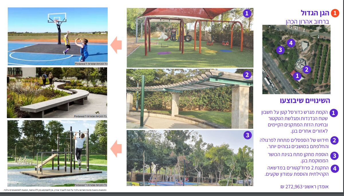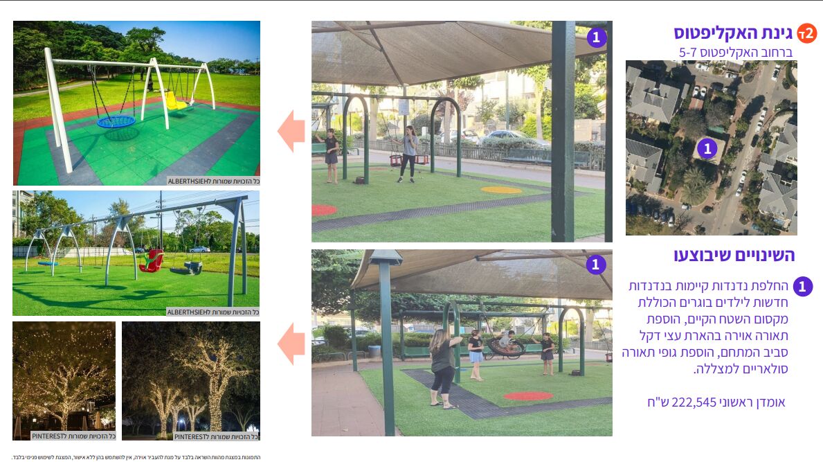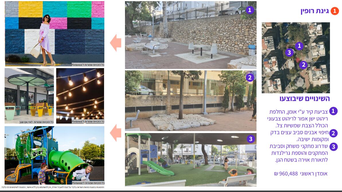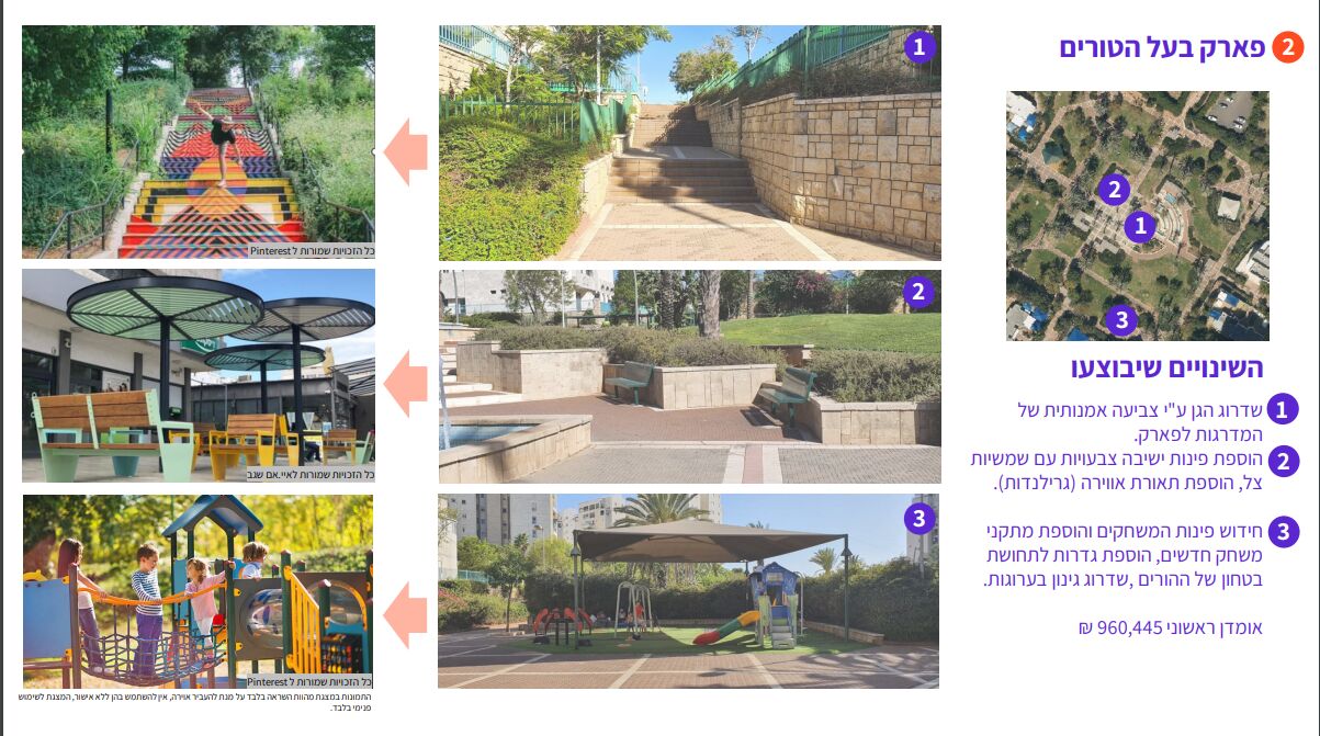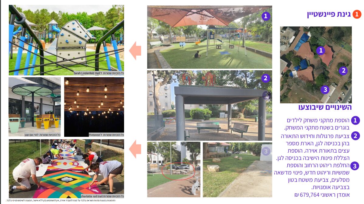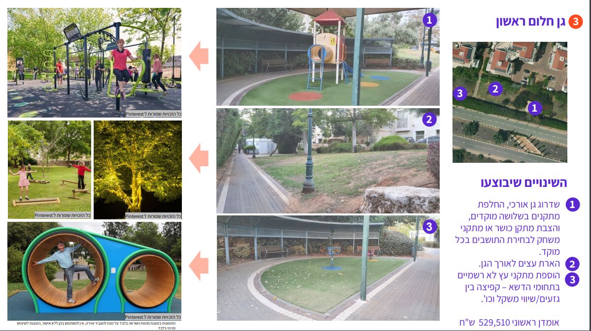 שדרוג הגן ע"י צביעה אמנותית של המדרגות לפארק, הוספת תאורת אווירה (גרילנדות). הוספת פינות ישיבה צבעוניות עם שמשיות צל, הוספת תאורת אווירה (גרילנדות). חידוש פינות המשחקים והוספת מתקני משחק חדשים, הוספת גדרות לתחושת בטחון של ההורים, שדרוג גינון בערוגות.