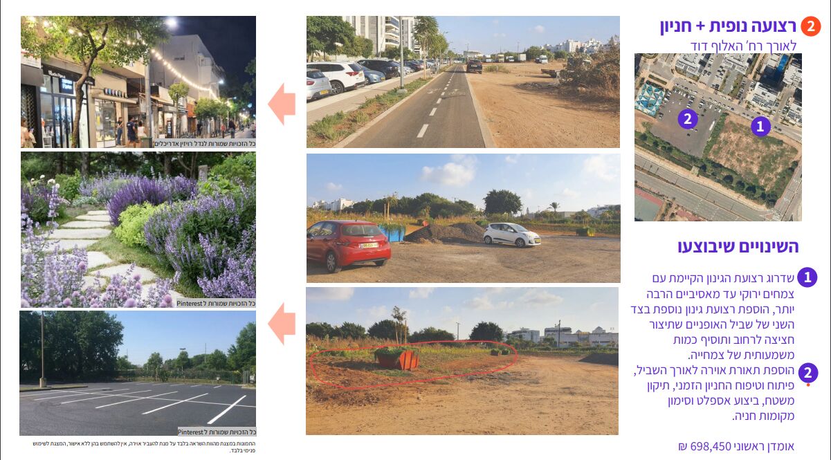 שדרוג רצועת הגינון הקיימת עם צמחים ירוקי עד מאסיביים הרבה יותר, הוספת רצועת גינון נוספת בצד השני של שביל האופניים שתיצור חציצה לרחוב ותוסיף כמות משמעותית של צמחייה. הוספת תאורת אוירה לאורך השביל, פיתוח וטיפוח החניון הזמני, תיקון משטח, ביצוע אספלט וסימון מקומות חניה.