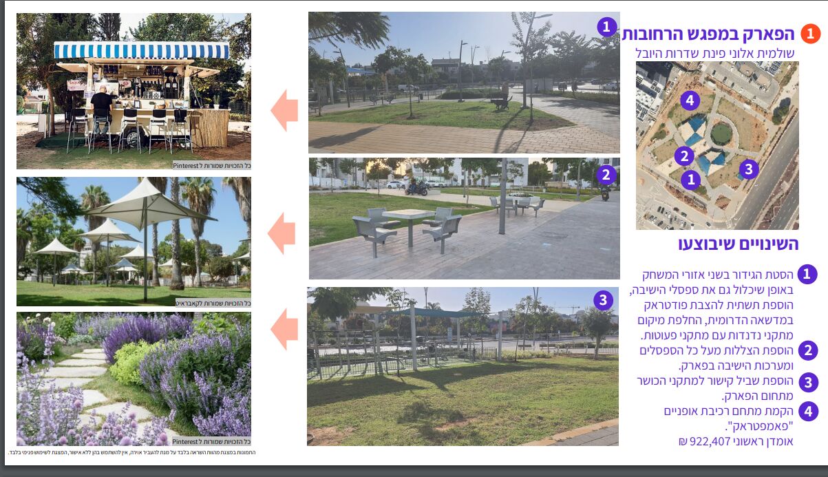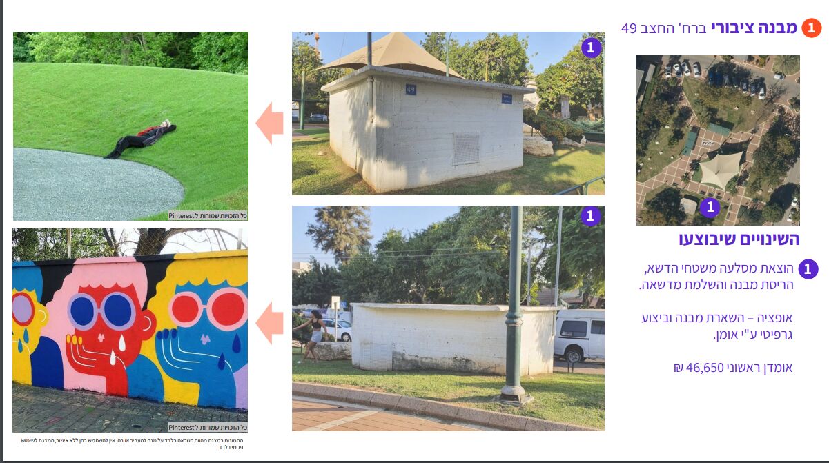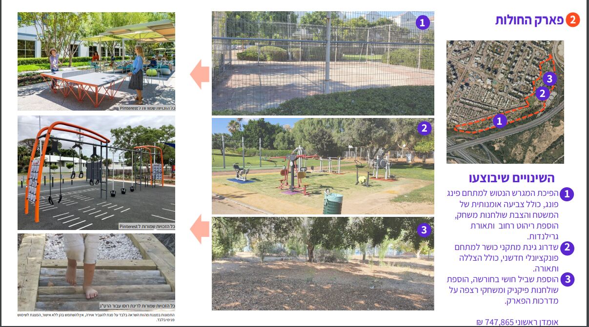 הפיכת המגרש הנטוש למתחם פינג פונג, כולל צביעה אומנותית של המשטח והצבת שולחנות משחק, הוספת ריהוט רחוב ותאורת אווירה (גרילנדות). שדרוג גינת מתקני כושר למתחם פונקציונלי חדשני, כולל הצללה ותאורה. הוספת שביל חושי בחורשה, הוספת שולחנות פיקניק ומשחקי רצפה על מדרכות הפארק.