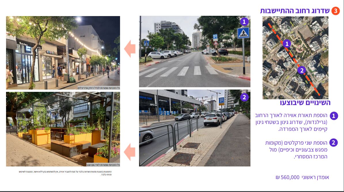 הוספת תאורת אווירה לאורך הרחוב (גרילנדות), שדרוג גינון בשטחי גינון קיימים לאורך המפרדה. הוספת שני פרקלטים (מקומות מפגש צבעוניים וכיפיים) מול המרכז המסחרי.