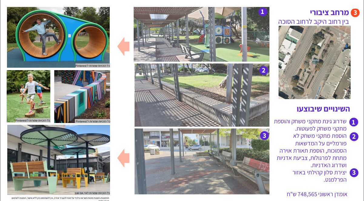 שדרוג גינת מתקני משחק והוספת מתקני משחק לפעוטות. הוספת מתקני משחק לא פורמליים על המדשאות הסמוכות, הוספת תאורת אוירה מתחת לפרגולות, צביעת אדניות ושדרוג האדניות. יצירת סלון קהילתי באזור הפרלמנט.