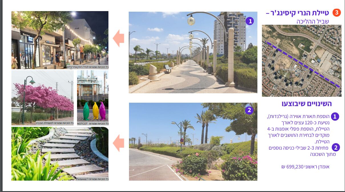 הוספת תאורת אווירה (גרילנדות), נטיעת כ -120 עצים לאורך הטיילת, הוספת פסלי אומנות ב-4 מוקדים לבחירת התושבים לאורך הטיילת. פתיחת 3-2 שבילי כניסה נוספים מתוך השכונה.