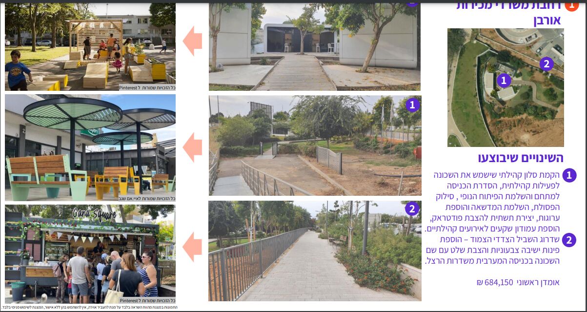 הקמת סלון קהילתי שישמש את השכונה לפעילות קהילתית, הסדרת הכניסה למתחם והשלמת הפיתוח הנופי, סילוק הפסולת, השלמת המדשאה והוספת ערוגות, יצירת תשתית להצבת פודטראק, הוספת עמודון שקעים לאירועים קהילתיים. שדרוג השביל הצדדי הצמוד – הוספת פינות ישיבה צבעוניות והצבת שלט עם שם השכונה בכניסה המערבית משדרות הרצל.