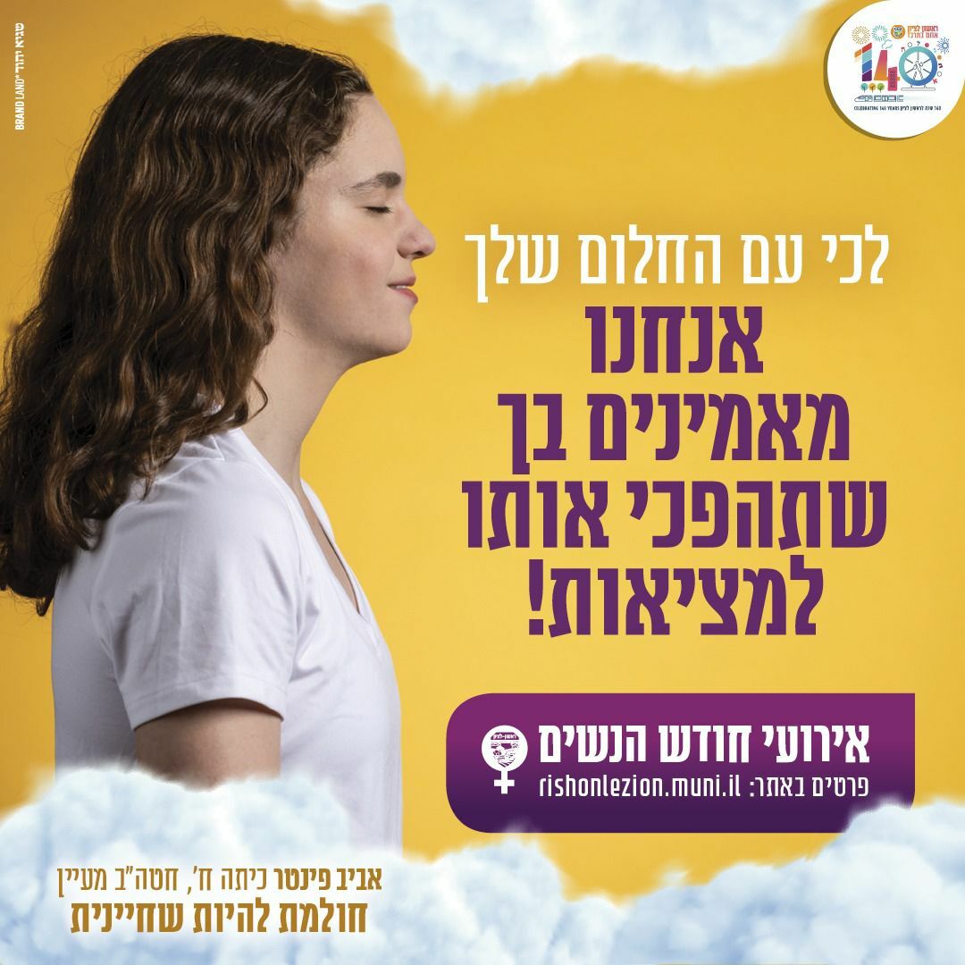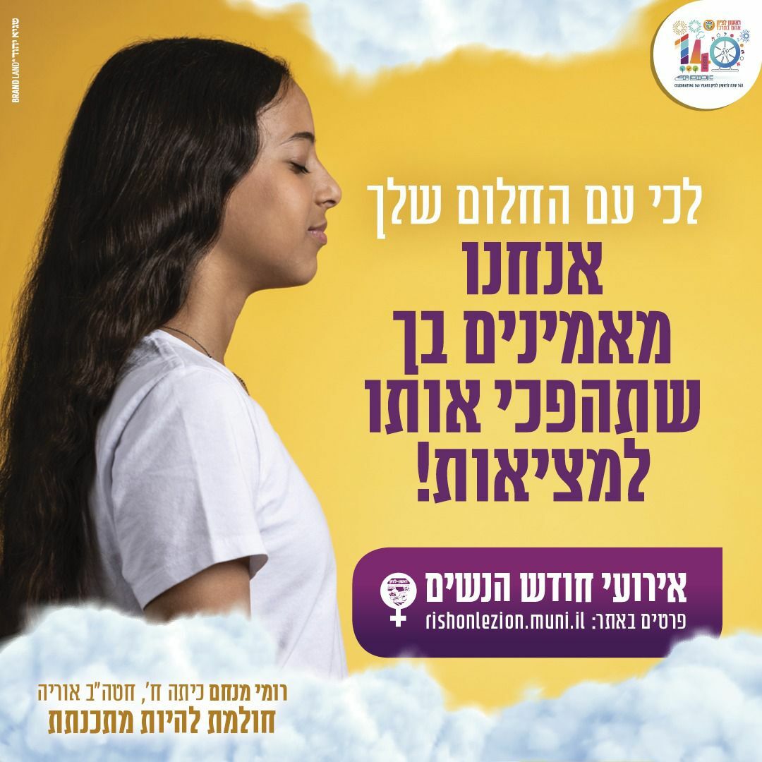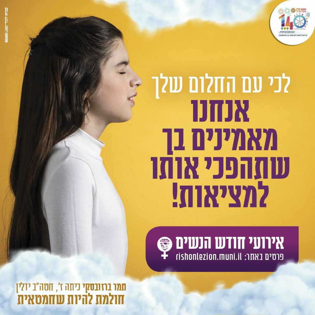 עיריית ראשון לציון מציינת את יום האישה הבינלאומי שחל היום (ד׳) ה-8 במרץ, בקמפיין שילוט חוצות מיוחד ברחבי העיר שבו משתתפות נערות וילדות מבתי הספר בעיר, תחת המסר: ״לכי עם החלום שלך. אנחנו מאמינים בך שתהפכי אותו למציאות״.