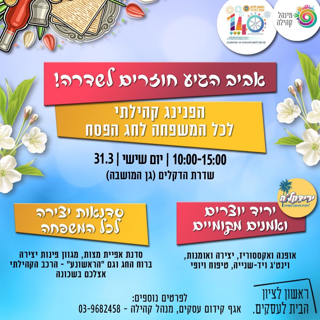 ביום שישי 31.3 יתקיים יריד פסח בגן המושבה עם מגוון דוכנים של פריטי אופנה, מוצרי טיפוח ויופי ועוד בנוסף הפנינג לכל המשפחה עם סדנת אפיית מצות ופינות יצירה
