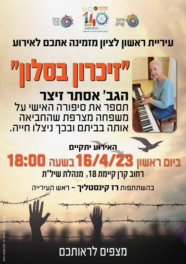 יום ראשון 16.4 שעה 18:00 "זיכרון בסלון" עם הגב' אסתר זיצר ברחוב קרן קיימת 18 מנהלת שירות לתושב .