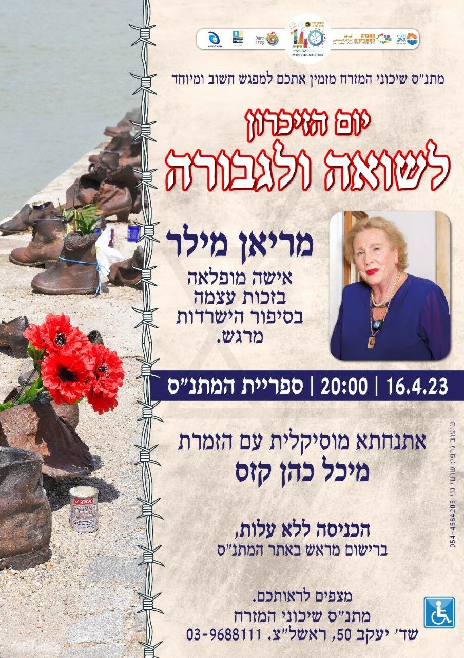 בשעה 20:00 במתנ"ס שיכוני המזרח ההרצאה של מריאן מילר, אמא של אדיר ואושיה מיוחדת בזכות עצמה בהרצאה מרתקת ומרגשת