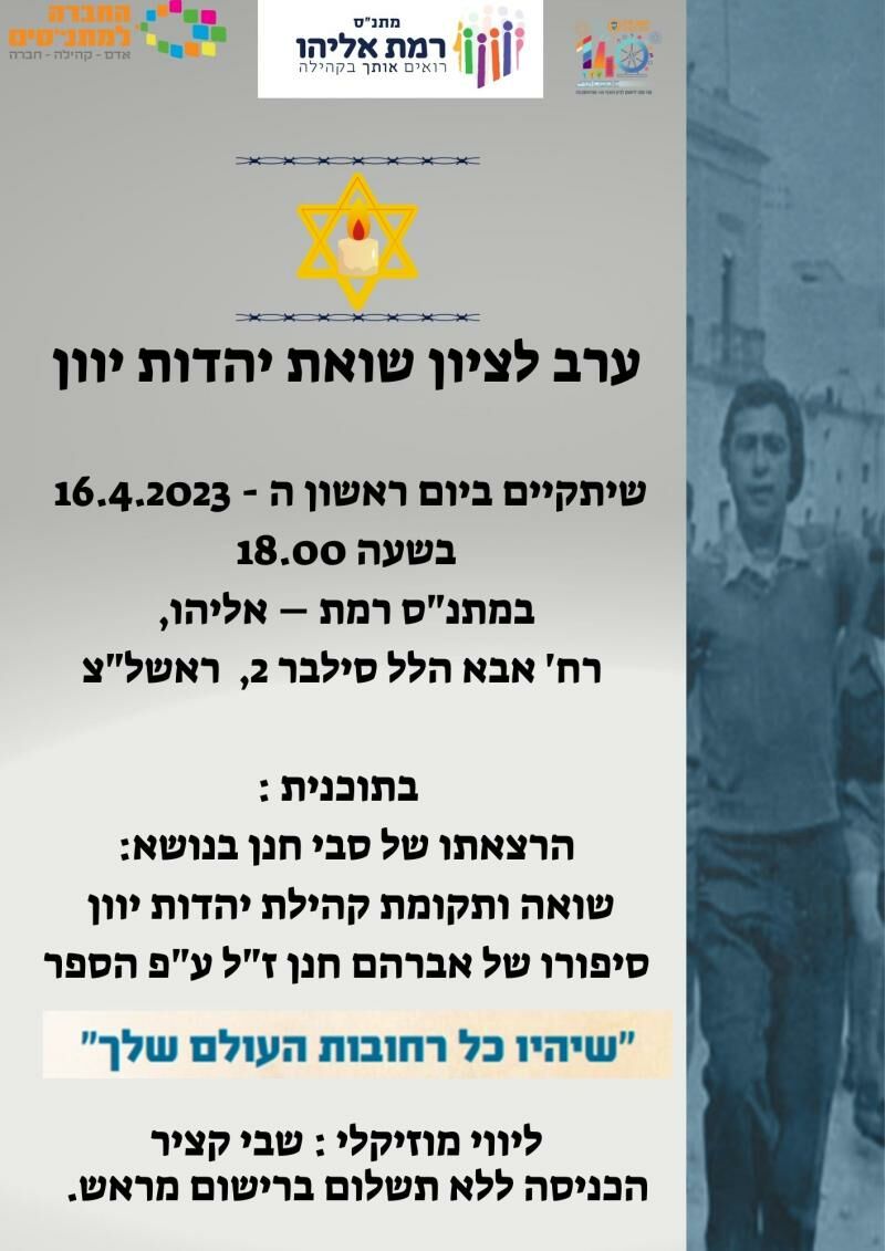 ערב לציון שואת יהדות יוון בשעה 18:00 באודיטוריום מתנ"ס רמת אליהו, הכניסה ללא תשלום ומותנית ברישום מראש באתר המתנ"ס- https://bit.ly/40gmJeb