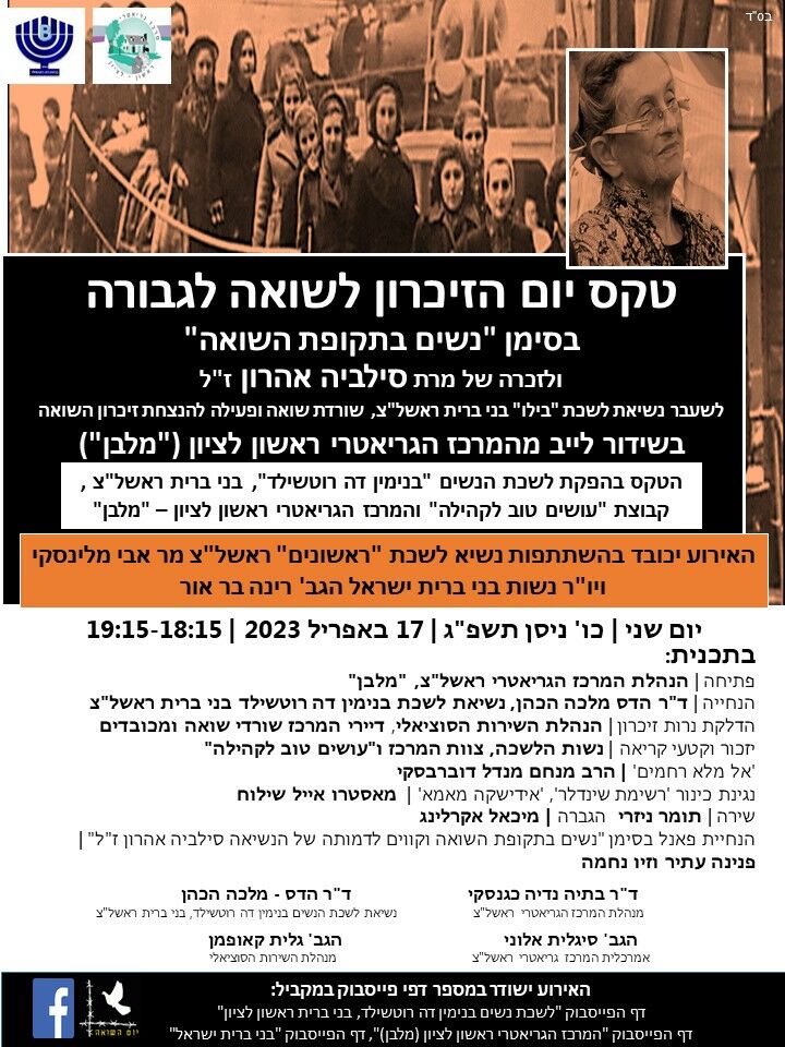 לשכת הנשים בנימין דה רוטשילד בשיתוף הנהלת וצוות המרכז הגריאטרי מלבן יקיימו גם השנה את טקס יום הזיכרון לשואה ולגבורה בבית החולים. השנה יוקדש הטקס לנושא נשים בתקופת השואה ולזכרה של מרת סילביה אהרון ז"ל, נשיאת לשכת בילו בני ברית ראשל"צ שנפטרה בדיוק לפני שנה (על כן הוחלט להקדיש את הטקס לזכרה שיוצא גם ביום השנה). הטקס יערך בשיתוף פעולה עם הנהלת ועובדי המרכז הגריאטרי ראשל"צ מלבן ובשיתוף עם קבוצת "עושים טוב לקהילה" בהובלת זיו נחמה. הטקס יתקיים במעמד מר אבי מלינסקי, נשיא לשכת ראשונים בני ברית ויו"ר נשות בני ברית הגב' רינה בר אור, דיירי המרכז ומשפחותיהם , צוות המרכז, משפחתה של סילביה אהרון ז"ל, ומוזמנים.