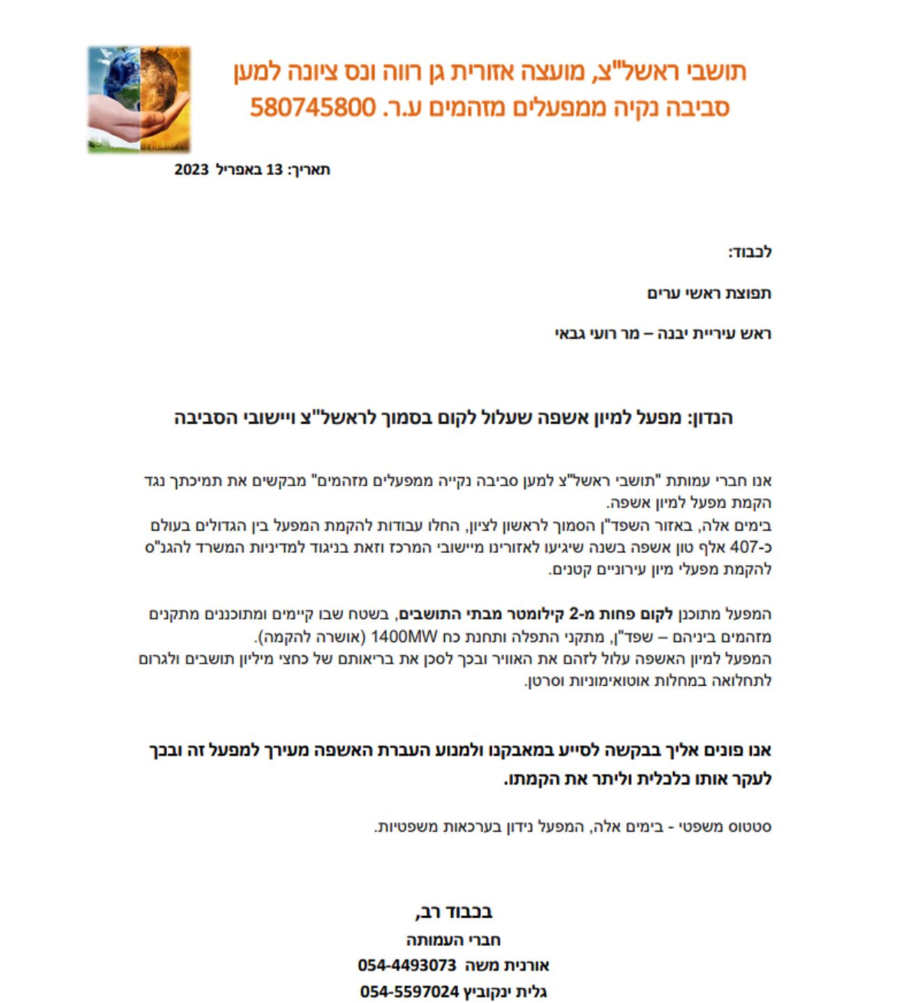 חברי עמותת "תושבי ראשון לציון למען סביבה נקייה ממפעלים מזהמים", בהובלת אורנית משה, אמיר נוי, גלית ינקוביץ' וסוזי כהן פנו אל יו"ר מרכז השלטון המקומי, ראשי ערים, מנהלי בנקים ובית החולים איכילוב להירתם למאבק כנגד מפעל הפסולת ולמנוע את העברת הפסולת שלהם למפעל