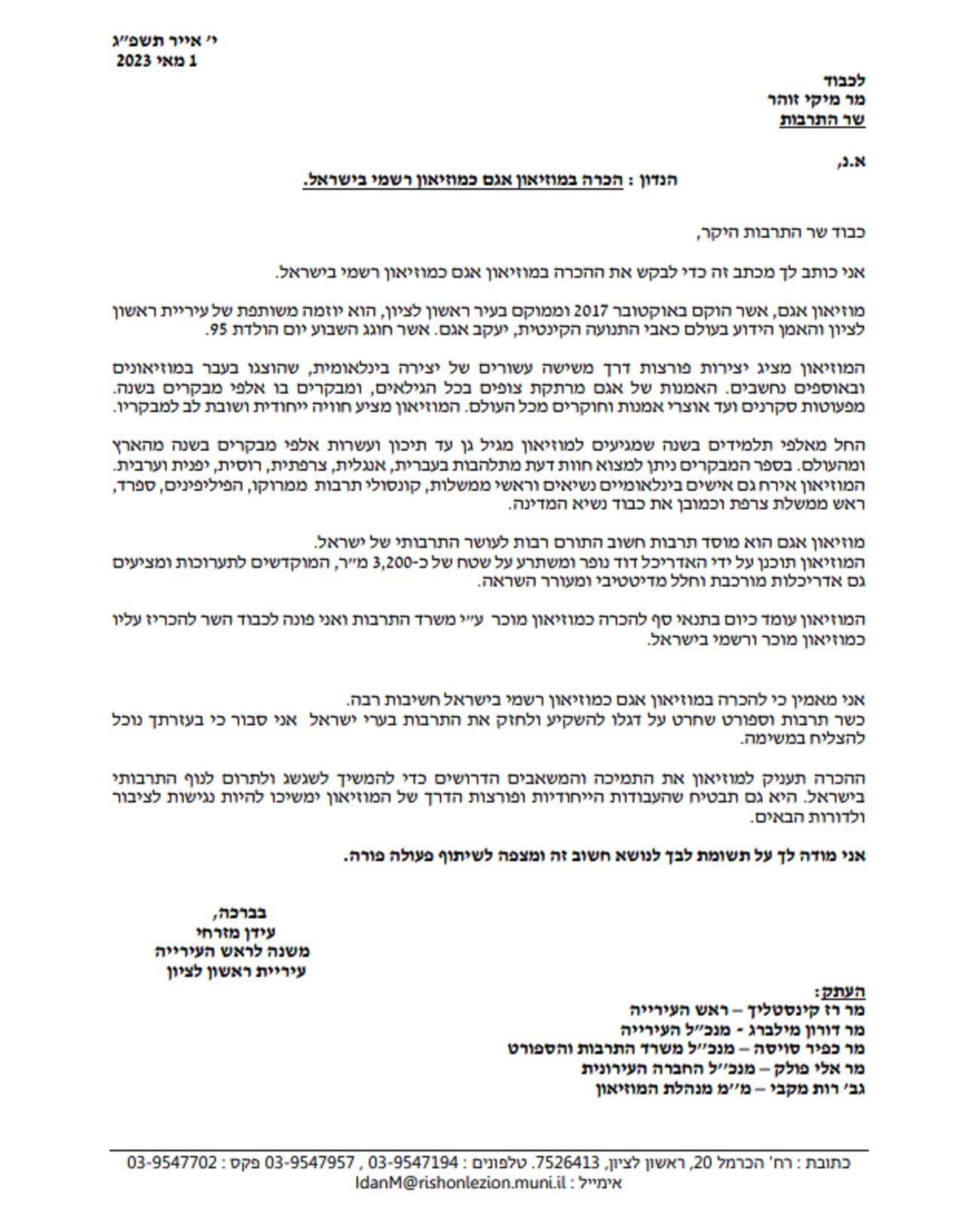 אנו מאמינים שהכרה רשמית של ממשלת ישראל תסייע לקדם את הנראות והמוניטין של המוזיאון שלנו ותבטיח את המשך הצלחתו לטובת תושבי העיר ראשון לציון וכל תושבי מדינת ישראל", אמר מזרחי.