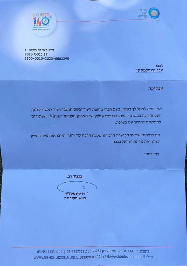 ביום ראשון 4.6 יפתחו בצרפת משחקי העולם של ארגון וירטוס (ספורטאי עילית הישגיים עם מוגבלות שכלית, אוטיזם ותסמונת דאון) בה יקח חלק שחקן הטניס שולחן, יובל ירוסלמסקי מראשון לציון