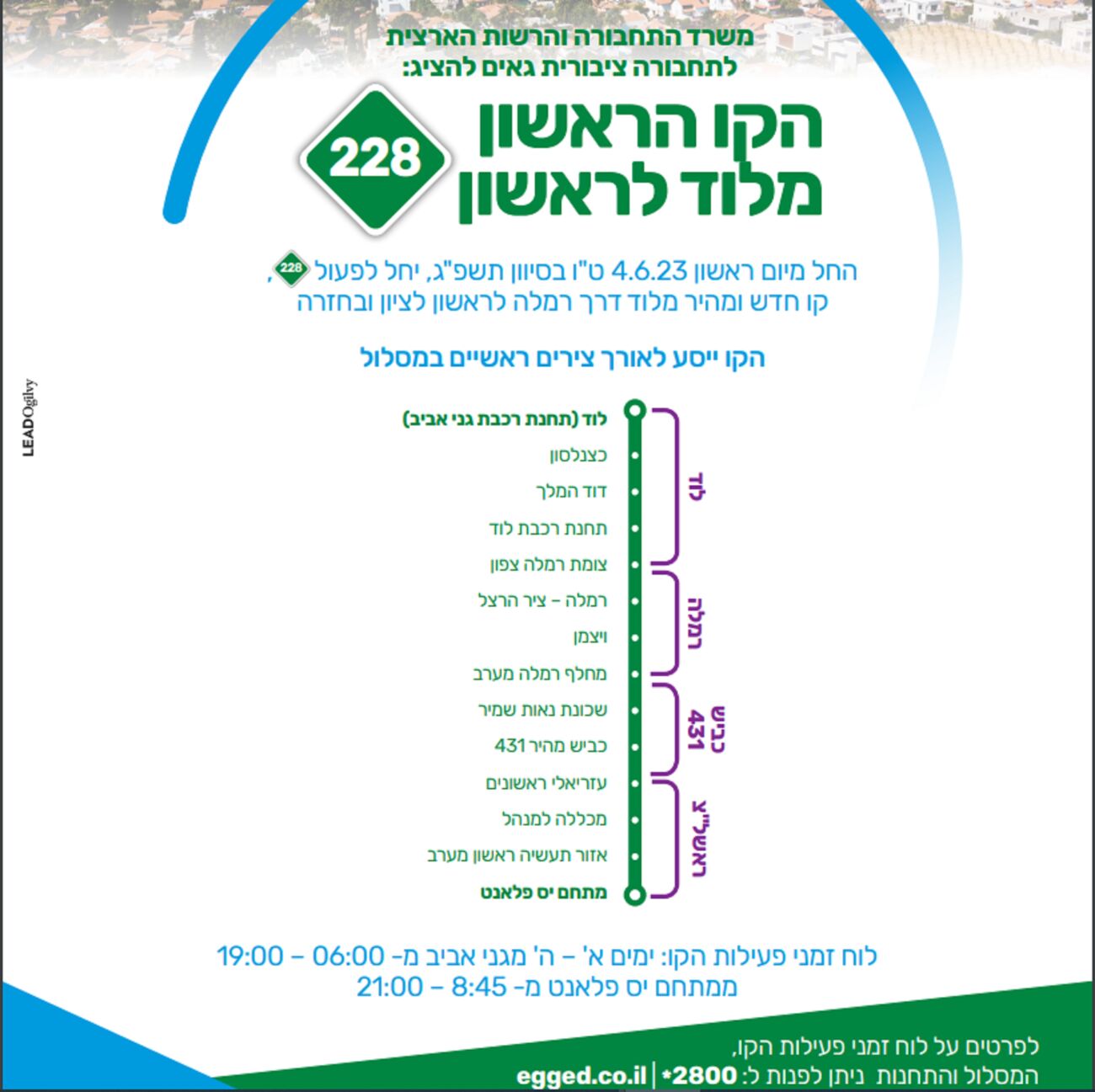החל מיום ראשון 4/6/2023 יופעל קו חדש 228 בראשון לציון במסלול מראשון לציון (חנה וסע) ללוד (גני אביב). הקו יופעל בשני הכיוונים.