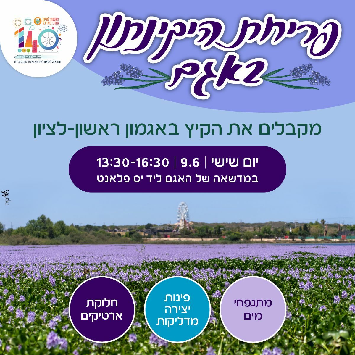 עיריית ראשון לציון מזמינה את התושבים להפנינג לכל המשפחה שיתקיים באגם הסופרלנד על מנת ליהנות מהפריחה של צמח היקינתון רגע לפני שהעירייה מסיימת את עבודות הפינוי שלו מהאגם על מנת למנוע פגיעה בו ובעלי החיים שבו.