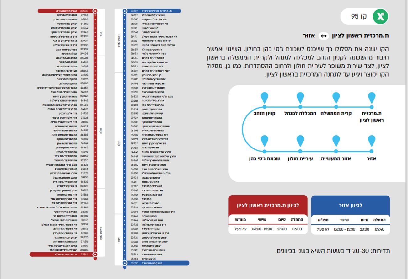 מוזיאון אגד חולון מסוף אזורי חן תל אביב יפו הקו ישנה את מסלולו כך שלא יעבור במערב ראשון לציון ויסיים את נסיעתו בחניון אגד בחולון. בנוסף, הקו לא יעבור בשכונת ג'סי כהן. מענה לשכונה יינתן באמצעות קו 95 שייכנס לשכונת ג'סי כהן וקו 171 המהיר לתל אביב.