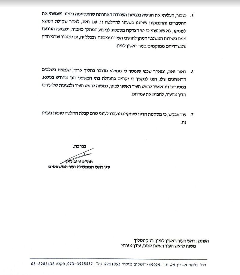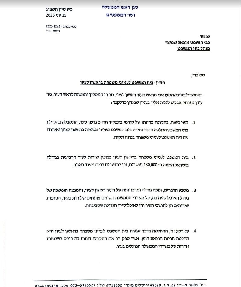 בעקבות פניית ראש העיר רז קינסטליך והמשנה לראש העיר עידן מזרחי לשר המשפטים, פנה השר שר המשפטים יריב לוין במכתב למנהל בתי המשפט השופט מיכאל שפיצר והביע את דעתו כי מדובר בהחלטה שגוייה והוא מבקש לזמן לדיון הקרוב העוסק בהעברת בית המשפט לענייני משפחה מראשון לציון לפתח תקווה את ראש העיר והמשנה לראש העיר כדי שיוכלו לביא את עמדתם כנגד המהלך.