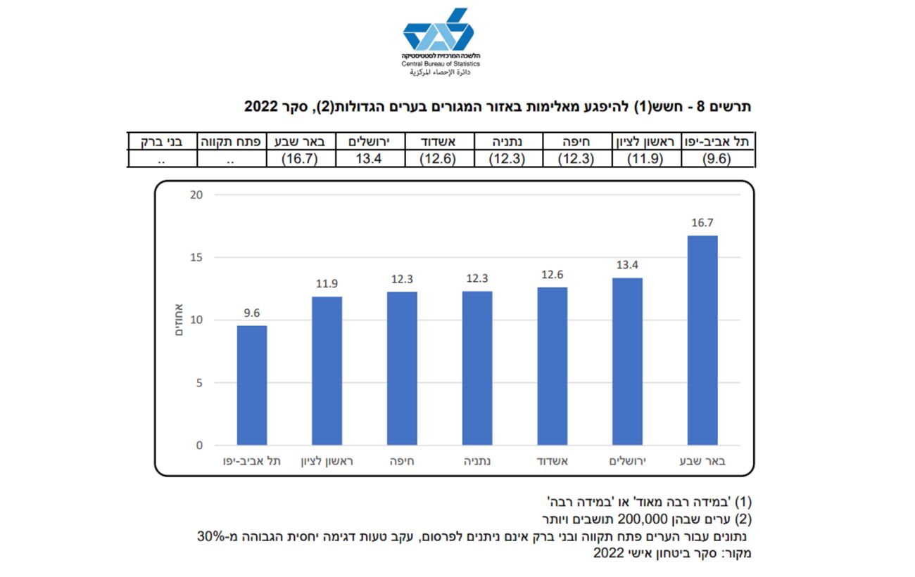האחוז הנמוך ביותר של החוששים להיפגע מאלימות באזור המגורים נמצאת בתל אביב עם 9.6%