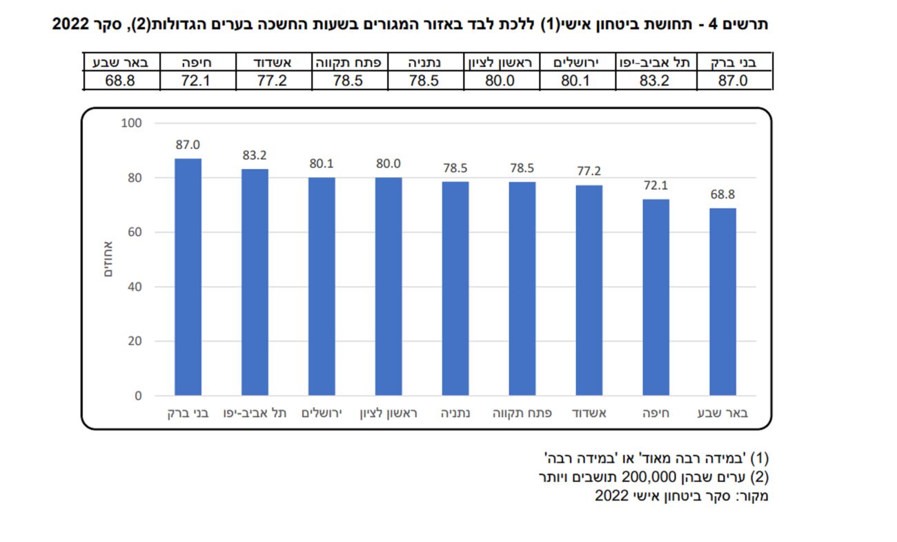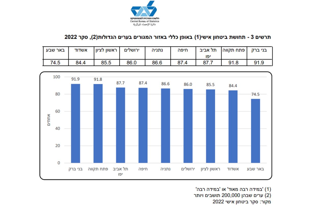 תחושת הביטחון הגבוהה ביותר באזור המגורים נמצאת בבני ברק ובפתח תקווה עם מעל 91%