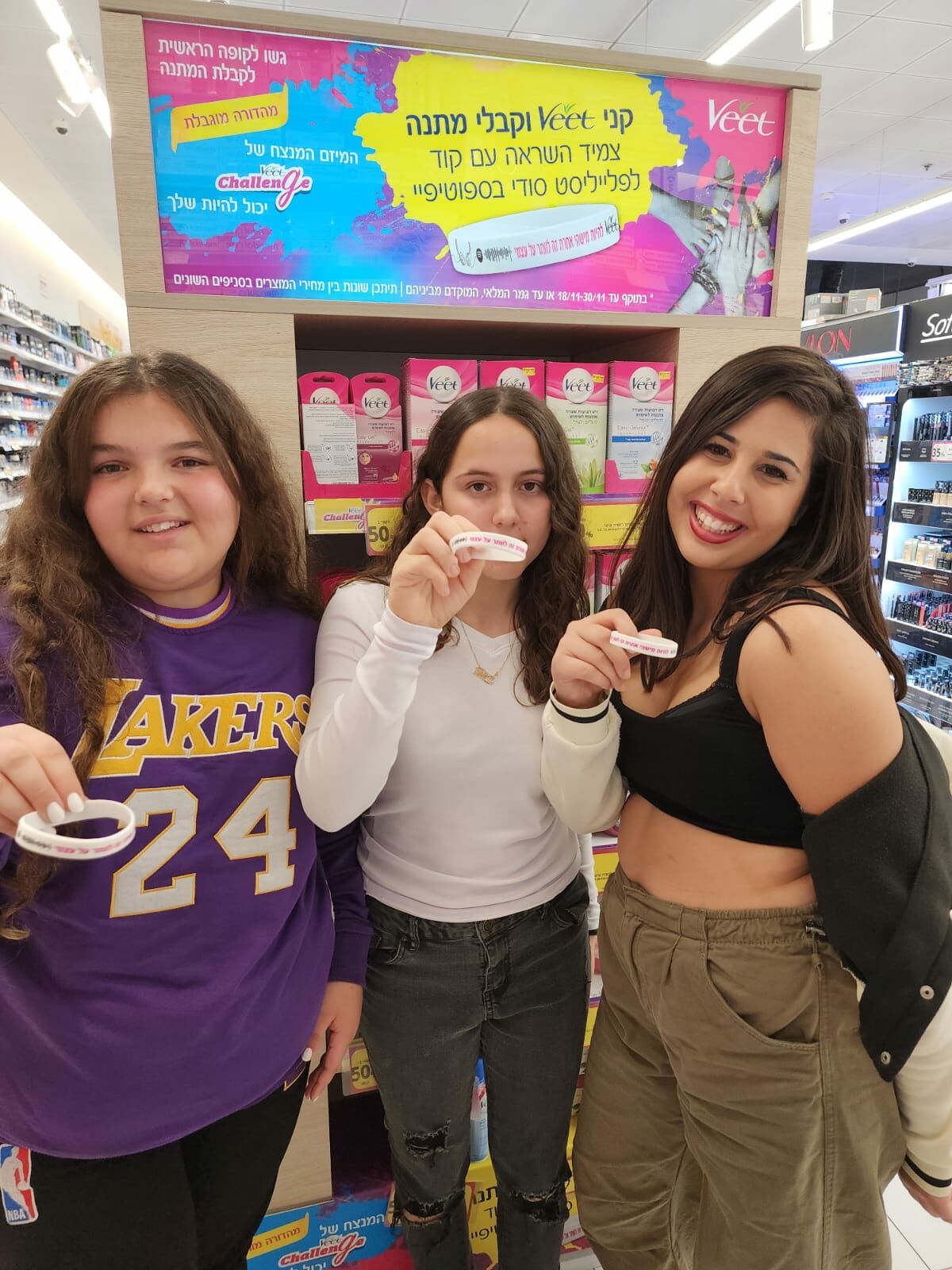 בתמונה שלושת הזוכות של שנה שעברה אופיר דדיה, לי וילנסקי ושירה חכגמירי בנות 14 וחצי מבאר שבע מציגות את הצמיד הזוכה עם הפרסום בסופר פארם שם חולק. קרדיט צילום עצמי. מאושר לפרסום ללא תמורה
