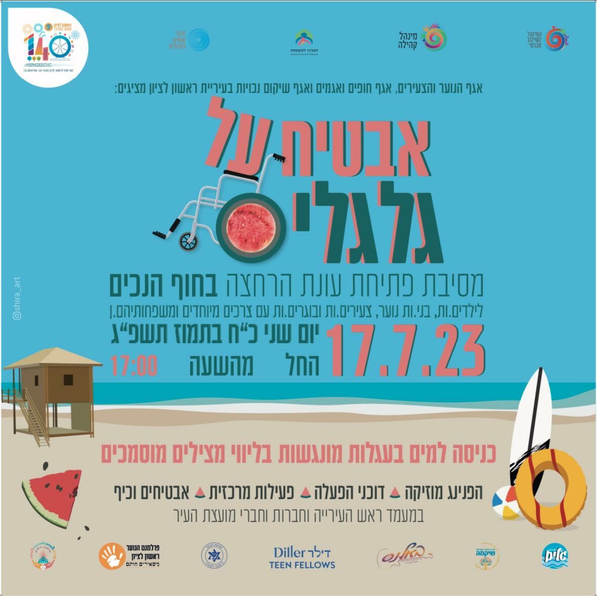 עיריית ראשון לציון תערוך מחר (שני 17.7) הפנינג עבור אנשים עם מוגבלויות בחוף הים. מדובר במסורת רבת שנים, של מיזם אבטיח על גלגלים במסגרתו אדם עם מגבלת תנועה יכול להיכנס למים באמצעות עגלות נכים ייחודיות להיכנס למים. את המיזם מובילים מינהל קהילה - אגף נוער וצעירים, אגף שיקום נכויות במינהל לשילוב חברתי, אגף חופים, , תנועת הנוער מכבי צעיר, פרלמנט הילדים והנוער ומרכז הנוער "גלים".