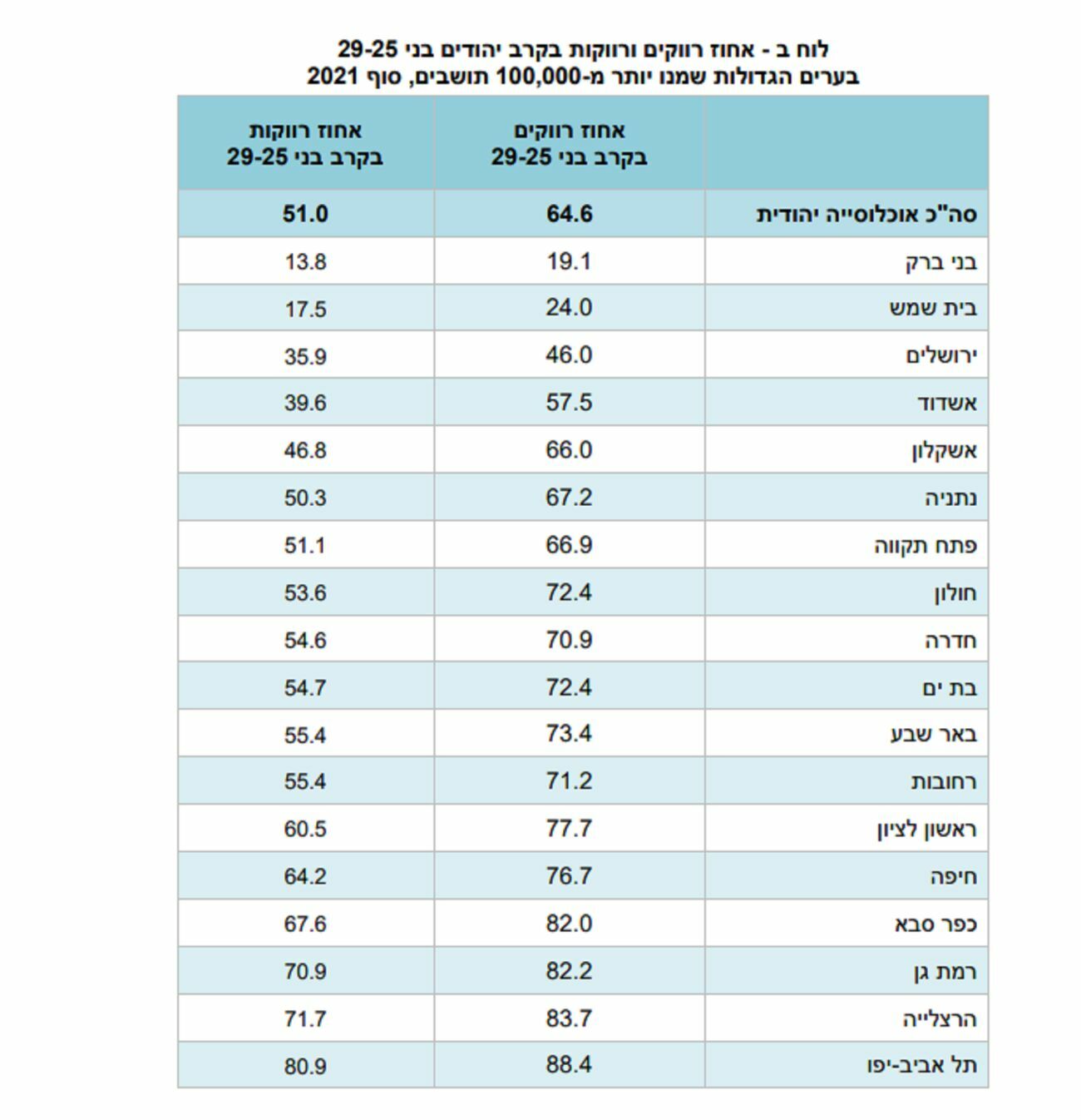 בקרב בני 25-29 עלה אחוז הרווקים היהודיים מ57% בסוף שנת 2000 ל65% בסוף שנת 2021. אחוז הרווקות היהודיות עלה צ36% ל51%.