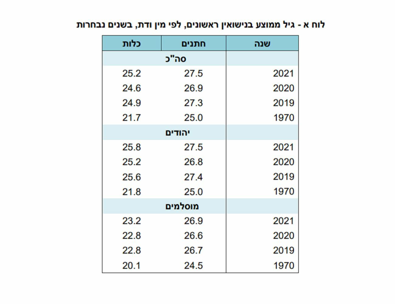 גיל הנישואין בממוצע בקרב החתנים שנישאו היה 27.5 בקרב כלל האוכלוסייה והן בקרב היהודים.