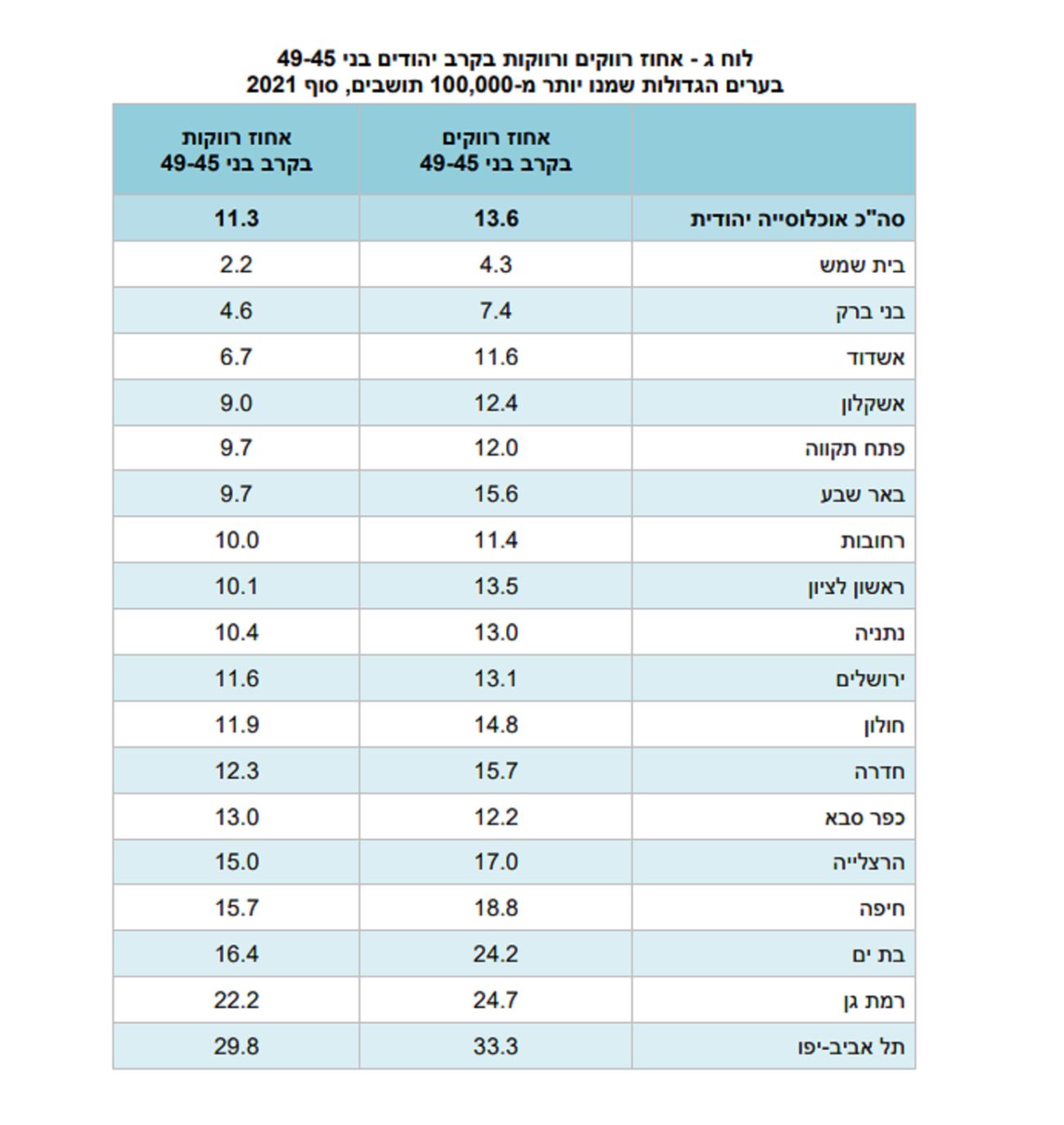 בערים תל אביב, רמת גן ובת ים קיים אחוז הרווקים הגדול בקרב בני 45-49 לעומת הערים בית שמש, בני ברק ואשדוד בהן נמצא האחוז הנמוך בקרב בני אותו גיל.