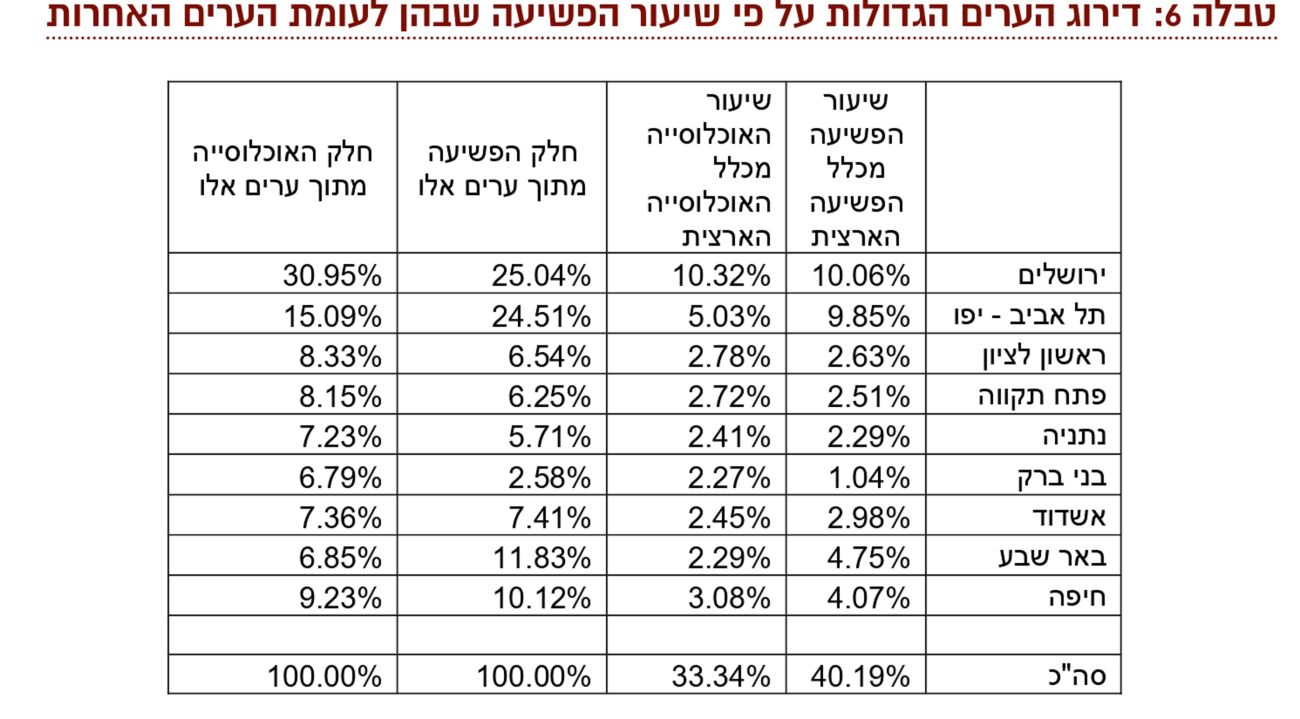 היקפי הפשיעה נבדקו בנפרד בערים ירושלים, תל אביב, ראשון לציון, פתח תקווה, נתניה, בני ברק, אשדד, באר שבע וחיפה.