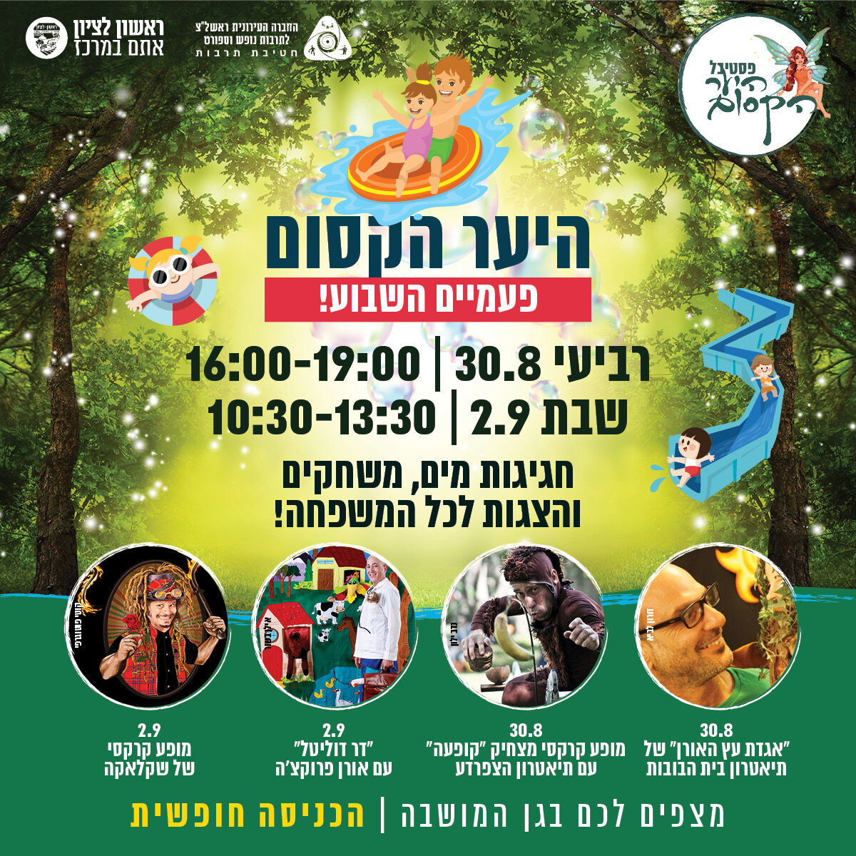 חטיבת תרבות בחברה העירונית מזמינה אתכם לחגיגת מים סדנאות יצירה משחקים והצגות ביער בגן המושבה.