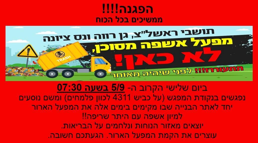 חברי המאבק כנגד מפעל הפסולת עמותת "תושבי ראשון לציון למען סביבה נקייה ממפעלים מזהמים", בהובלת אורנית משה וגלית ינקוביץ' קוראים לתושבי ראשון לציון להגיע מחר(שלישי 5.9) בשעה 7:30 בבוקר להפגנת מחאה שתתקיים באזור המפעל במטרה למנוע את הקמתו