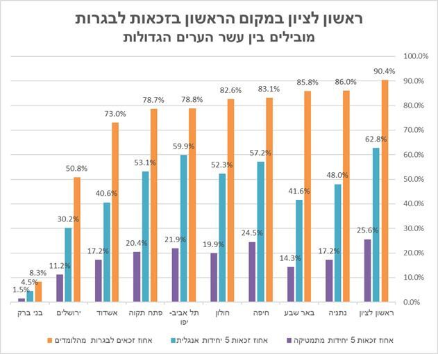גם באחוז הניגשים ל-5 יח"ל בבגרות למתמטיקה, ראשון לציון מובילה במקום הראשון מבין עשר הערים הגדולות עם 25.6% זכאות, זאת לעומת 25.4% בשנת תשפ"א ולעומת 17.3% בממוצע הארצי.