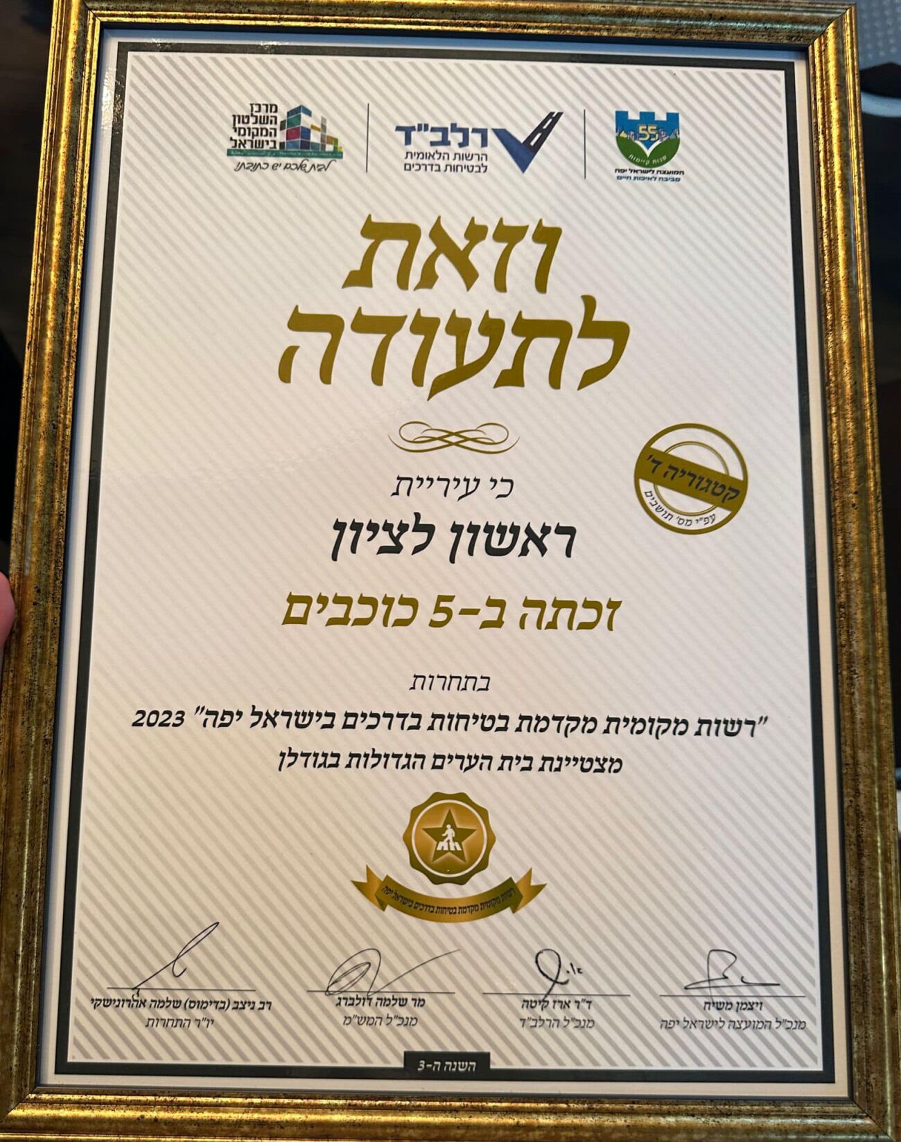 ראשון לציון, זכתה באות הצטיינות בתחרות "רשות מקומית מקדמת בטיחות בדרכים בישראל יפה" של הרלב"ד והמועצה לישראל יפה