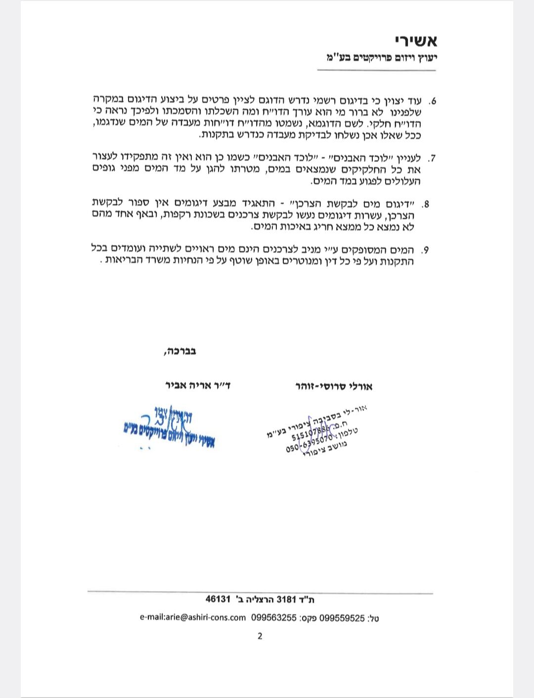 התושבים של המתחמים אף ערכו בדיקה של חברה להנדסת מים והנתונים הוצגו גם לחברת מניב אשר העבירה זאת לבדיקה של חברת אשירי אשר נחשבת למומחית ומייעצת לתאגידי המים בנושא. על פי חוות הדעת של החברה הבדיקה שנערכה על ידי החברה שהוזמנה על ידי התושבים אינה עומדת בתקנים של משרד הבריאות וכי הדוח שנשלח אינו מלא, חסרים בו הדוחות של המעבדה, עם ניסוחים לא מקצועיים וכן לא נכתב מי ערך את הבדיקה ומהי השכלתו.