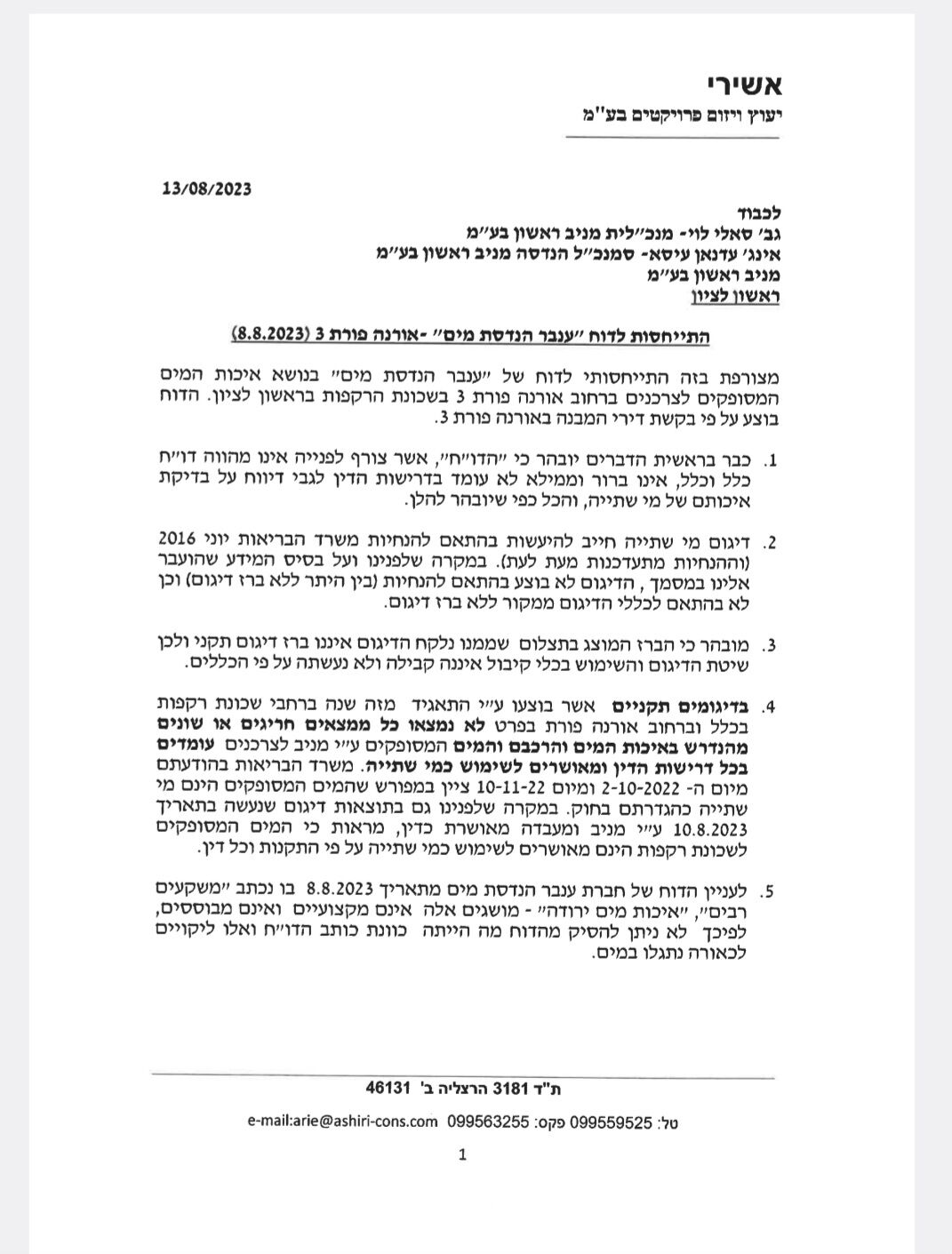 "איכות המים המסופקת על ידי תאגיד המים למתחמים בשכונת ״רקפות״ בעיר, נמצאה תקינה בהתאם לכל המדדים. בחודש ספטמבר 2022 דווח על מים עכורים במספר דירות בשכונת רקפות. תאגיד המים פעל בתיאום עם הדיירים ועם משרד הבריאות. צוותי התאגיד פעלו בשטח באופן רציף, שטפו את מערכות המים העירוניות (ועושים זאת על בסיס שבועי) ומקיימים קשר ישיר עם הדיירים. במהלך השנה האחרונה בוצעו מאות בדיקות לאיכות המים במיקומים שונים בשכונה - לרבות בנוכחות התושבים - וכולן נמצאו תקינות. משרד הבריאות ביצע גם כן בדיקות אשר נמצאו תקינות ולכן המליץ לדיירים לבדוק את מערכות המים הפרטיות.