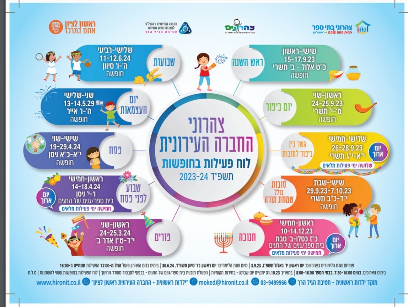 בהתאם לשינויים של בחופשות צהרוני גני הילדים ובתי הספר של החברה העירונית בראשון לציון יפעילו את בית הספר של החגים למשך 3 ימים בגשר שבין יום הכיפורים לערב סוכות 26-28.9.23