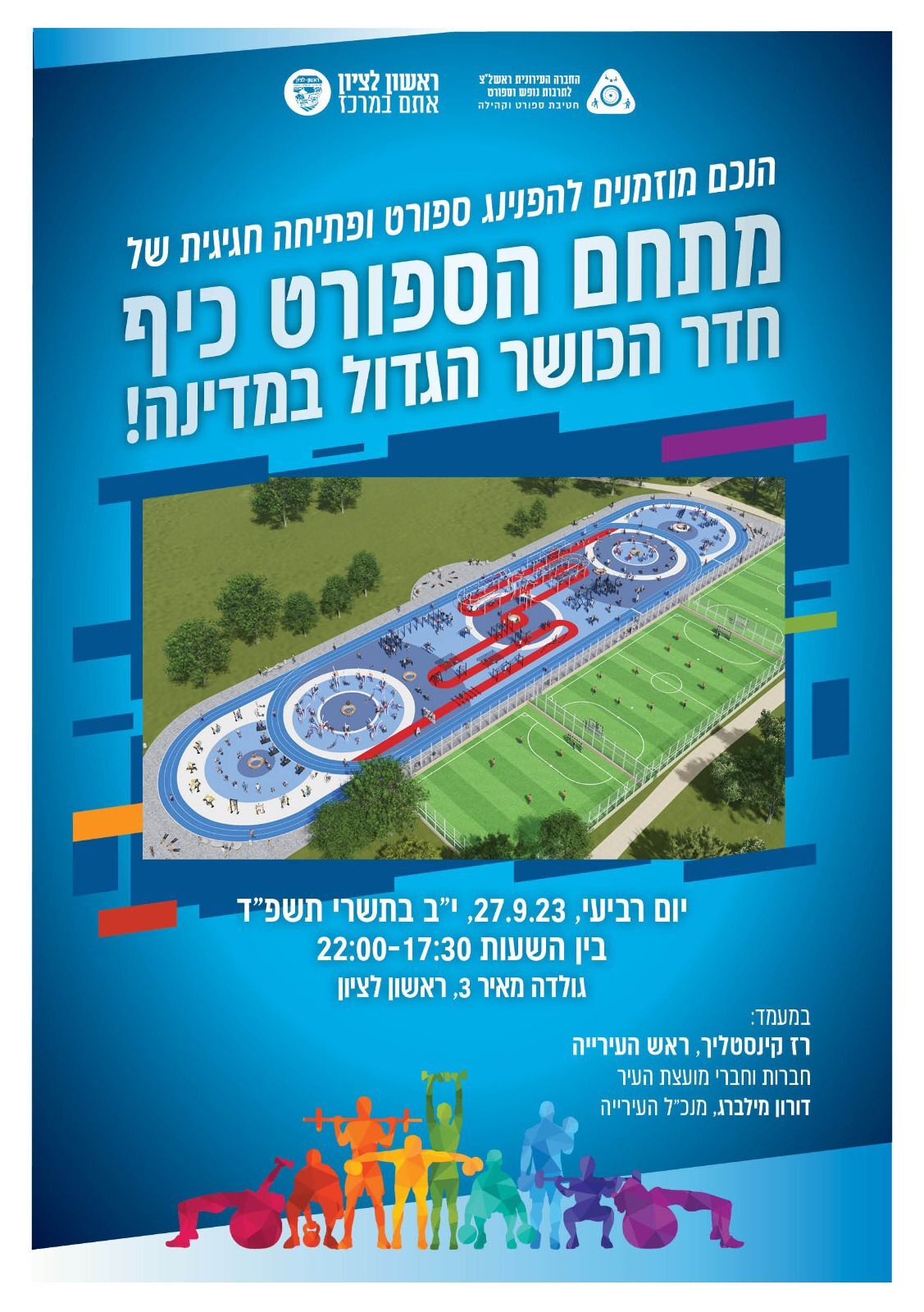 עיריית ראשון לציון תחנוך את מתחם הספורט כיף המחודש - מתחם הכושר הרב תחומי הגדול במדינה - באירוע חגיגי שיתקיים ביום רביעי הבא, 27.9.23, בשעה 17:30. האירוע יתקיים במעמד ראש העירייה - רז קינסטליך, חברות וחברי מועצת העיר, מנכ״ל העירייה - דורון מילברג ומכובדים נוספים. הקהל הרחב מוזמן להגיע לפתיחה החגיגית.