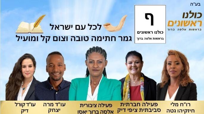 אלסה ברוך מציגה את רשימת "כולנו ראשונים": 1. אלסה ברוך 2. ציפי דיק 3. עו"ד מרה יצחק 4. רו"ח מלי חזקיהו 5. עו"ד קורל דיק 6. אורן קאשי .7. שאוליאן יעקב 8. גזאצ'ו סנבתו 9. משה ברוך 10. צביקה קוזלובסקי