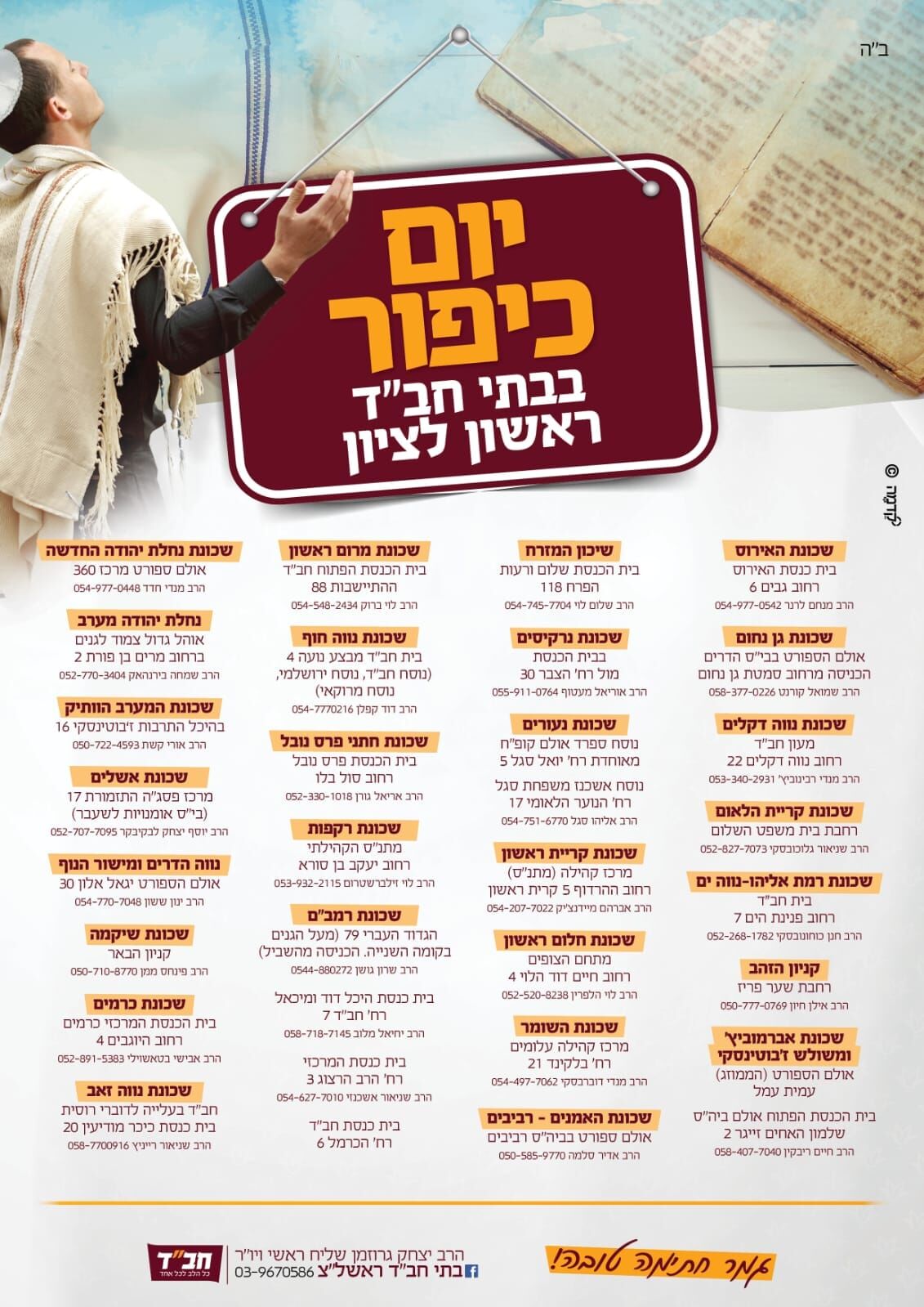 בדיוק בשבילכם בתי חב"ד בראשון לציון יפתחו במהלך יום הכיפורים עשרות מוקדים של "בית-הכנסת הפתוח", בהם תוכלו להתפלל ולקבל סיוע של נציגי חב"ד.