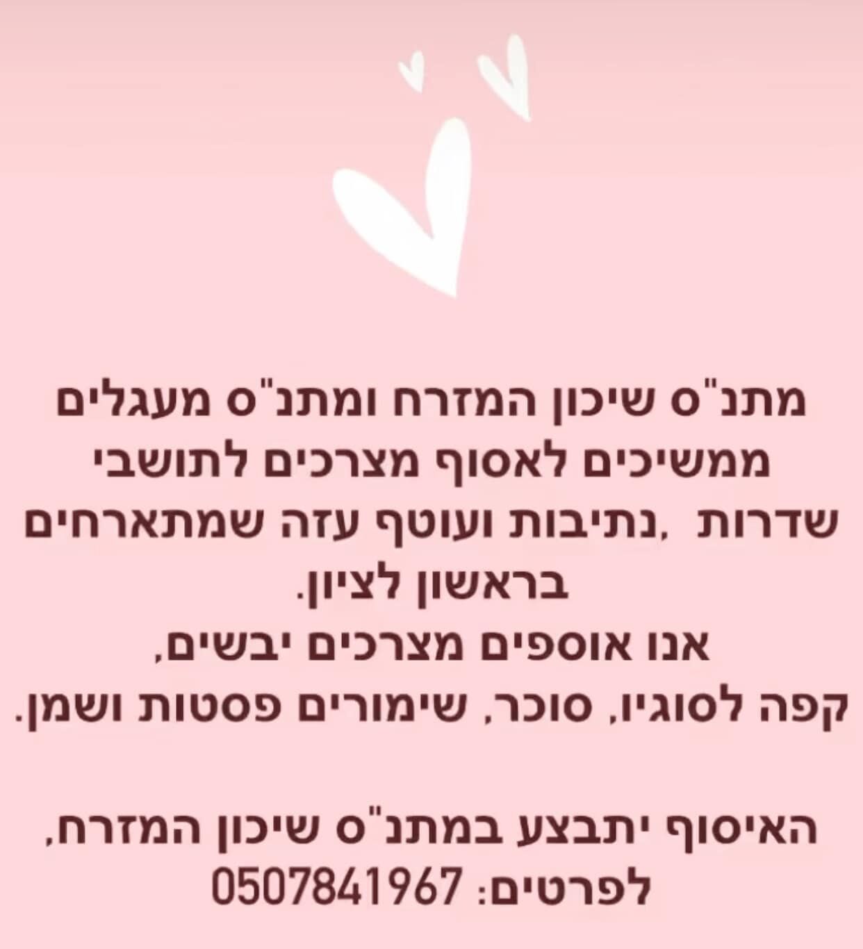 האיסוף מתקיים בתוך מתנ"ס שיכון המזרח -ניתן להשאיר המצרכים במשחקיה - חצי קומה למטה מימין למזכירות